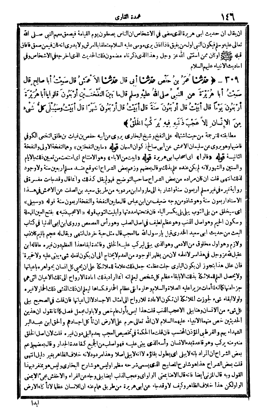 4184 - حدَّثنا عُمَرُ بنُ حَفْص حدّثنا أبي قَالَ حدّثنا الأعْمَشُ قَالَ سَمِعْتُ أَبَا صالِحٍ قَالَ سَمِعْتُ أَبَا هُرَيْرَةَ عَنِ النَّبِيِّ صلى الله عَلَيْهِ وَسلم قَالَ مَا بَينَ النَّفْخَتَيْنِ أرْبَعُونَ قَالُوا يَا أَبَا هُرَيْرَةَ أرْبَعُونَ يَوْماً قَالَ أبَيْتُ قَالَ أرْبَعُونَ سَنَةً قَالَ أبَيْتُ قَالَ أرْبَعُونَ شَهْراً قَالَ أبَيْتُ وَسَيُبْلَى كُلُّ شَيْءٍ مِنَ الإنْسَانِ إلاّ عَجْبَ ذَنَبِهِ فِيهِ يُرَكَّبُ الخَلْقُ.