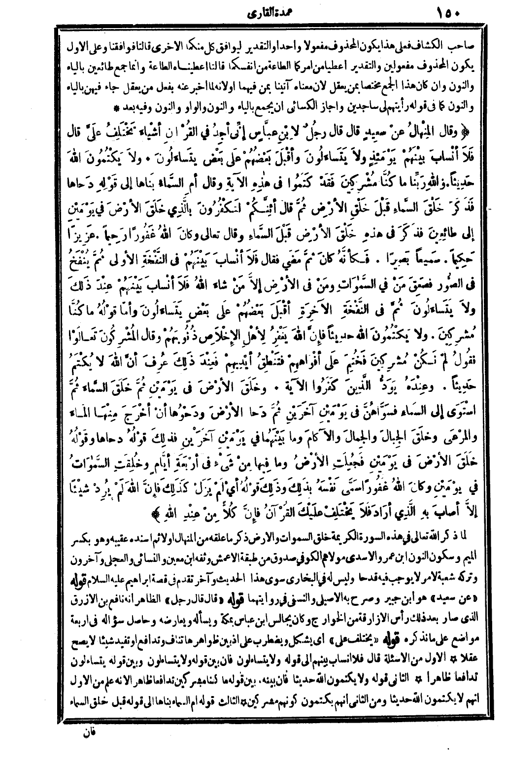 وَقَالَ المِنْهالُ عَنْ سَعِيدٍ قَالَ قَالَ رجُلٌ لابْنِ عَبَّاسٍ إنِّي أجِدُ فِي القُرْآنِ أشْياءَ تَخْتَلِفُ عَلَيَّ، قَالَ: {فَلاَ أنْسابَ بَيْنَهُمْ يَوْمَئِذٍ وَلاَ يَتَساءَلُونَ} (الْمُؤْمِنُونَ: 101) و {أقْبَلَ بَعْضُهُمْ عَلَى بَعْض يَتَساءَلُونَ} (الصافات: 72 و 05 وَالطور: 52) . {وَلاَ يَكْتُمُونَ الله حَدِيثاً} . {وَلَا يَكْتُمُونَ الله حَدِيثاً} (النِّسَاء: 24) {وَالله رَبِّنا مَا كُنَّا مُشْرِكِينَ} (الْأَنْعَام: 32) فَقَدْ كَتَمُوا فِي هاذِهِ الْآيَة، وَقَالَ: {أم السَّماءُ بَناها} إِلَى قَوْلِهِ: {دَحاها} (النازعات: 72 و 03) فَذَكَرَ خَلْقَ السَّماءِ قَبْلَ خَلْقِ الأرْضِ، ثُمَّ قَالَ: {أئِنَّكُمْ لَتكْفُرُونَ بالَّذِي خَلَقَ الأرْضَ فِي يَوْمَيْنِ} إِلَى {طائعين} (فصلت: 9 و 11) فَذَكَرَ فِي هاذِهِ خَلْقَ الأرْض قَبْلَ السَّماءِ، وَقَالَ تَعَالَى: {وكانَ الله غَفُوراً رَحِيماً} . عَزِيزاً حَكِيماً. سَميعاً بَصِيراً. فَكأنَّهُ كانَ ثُمَّ مَضَى، فَقَالَ: فَلاَ أنْسابَ بَيْنَهُمْ فِي النَّفْخَةِ الأولى {ثُمَّ يُنْفَخُ فِي الصُّور فصَعِقَ مَنْ فِي السَّماوَاتِ ومَنْ فِي الأرْضِ إلاَّ مَنْ شاءَ الله فَلاَ أنْسابَ بَيْنَهُمْ عِنْدَ ذالِكَ وَلاَ يَتَساءَلُونَ} ثُمَّ فِي النَّفْخَةِ الآخِرَةِ. {أقْبَلَ بَعْضُهُمْ عَلَى بَعْضٍ يَتَساءَلُونَ} وأمّا قَوْلُهُ: {مَا كُنَّا مُشْرِكِينَ} . {وَلَا يَكْتُمُونَ الله حدِيثاً} فإنَّ الله يَغْفِرُ لأهْلِ الإخْلاَصِ ذُنُوبَهُمْ، وَقَالَ المُشْرِكُونَ: تَعالَوْا نقُولُ: لَمْ نكُنْ مُشرِكينَ، فَخُتِمَ عَلَى أفْواهِهِمْ فَتَنْطِقُ أيْدِيهِمْ فَعِنْدَ ذالِكَ عُرِفَ أنَّ الله لَا يُكْتَمُ حَدِيثاً. وعِنْدَهُ: {يَوَدُّ الَّذِينَ كَفَرُوا} (النِّسَاء: 24) . و {خَلَقَ الأرْضَ فِي يَوْمَينِ ثُمَّ خَلَقَ السَّماءَ ثُمَّ اسْتَوَى إِلَى السَّماءِ فَسَوَّاهُنَّ فِي يَوْمَيْنِ آخَرَيْنِ ثُمَّ دَحا الأرْضَ ودَحْوُها أنْ أخْرَجَ مِنْهَا المَاءَ والمرْعَى وخَلَقَ الجِبالَ والجمالَ والآكامَ وَمَا بَيْنَهُما فِي يَوْمَيْنِ آخَرَيْنِ} فذلِكَ قَوْلُهُ: {دحاها} وقَوْلُهُ: {خَلَقَ الأرْضَ فِي يَوْمَيْنِ} (فصلت: 9) فَجُعِلَتِ الأرْضُ وَمَا فِيها مِنْ شَيْءٍ فِي أرْبَعَةِ أيَّامٍ وخُلِقَتِ السَّماوَاتُ فِي يَوْمَيْنِ وكانَ الله غَفُوراً سَمَّى نَفْسَهُ بِذَلِكَ وذَلِكَ. قَوْلُهُ: أيْ لَمْ يَزَلْ كَذَلِكَ فإنَّ الله لَمْ يُرِدْ شَيْئاً إلاَّ أصابَ بِهِ الَّذِي أرَادَ، فَلاَ يَخْتَلِفْ عَلَيْكَ القُرْآنُ، فإِنَّ كُلاًّ مِنْ عِنْدَ الله.