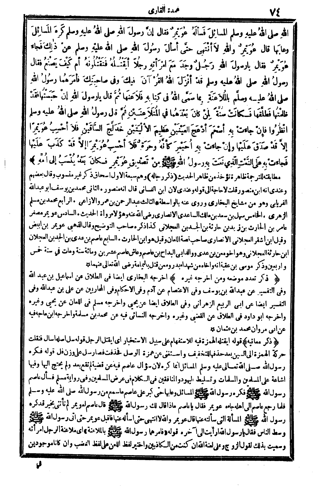 ُ الله صلى الله عَلَيْهِ وَسلم المَسائِلَ فَسَألَهُ عُوَيْمِرٌ فَقَالَ إنَّ رسولَ الله صلى الله عَلَيْهِ وَسلم كَرِهَ المَسائِلَ وعابَها قَالَ عُوَيْمِرٌ وَالله لاَ انْتَهى حَتَّى أسألَ رسُولَ الله صلى الله عَلَيْهِ وَسلم عنْ ذالِكَ فَجاء عُوَيْمِرٌ فَقَالَ يَا رسولَ الله رَجُلٌ وَجَدَ مَعَ امْرَأتِهِ رَجُلاً أيَقْتُلُهُ فَتَقْتُلُونَهُ أم كَيْفَ يَصْنَعُ فَقَالَ رسولُ الله صلى الله عَلَيْهِ وَسلم قَدْ أنْزَلَ الله القُرْآنَ فيكَ وَفِي صاحِبَتِكَ فأمَرَهُما رسُولُ الله صلى الله عَلَيْهِ وَسلم وسلَّم بالمُلاَعَنَةِ بِما سَمَّى الله فِي كِتابِهِ فَلاَعَنَها ثُمَّ قَالَ يَا رسولَ الله إنْ حَبَسْتُها فَقَدْ ظلمْتُها فَطلَّقَها فَكانَتْ سُنَّة لِمَنْ كانَ بَعْدَهُما فِي المُتَلاَعِنَيْنِ ثُمَّ قَالَ رسولُ الله صلى الله عَلَيْهِ وَسلم انْظُرُوا فإنْ جاءَتْ بِهِ أسْحَمَ أدْعَجَ العَيْنَبْنِ عَظِيمَ الألْيَتَيْنِ خَدَلَّجَ السَّاقَيْنِ فَلاَ أحْسِبُ عُوَيْمِراً إلاَّ قَدْ صَدَقَ عَلَيْها وإنْ جاءَتْ بِهِ أحَيْمِرَ كأنَّهُ وحَرَةٌ فَلاَ أحْسِبُ عُوَيْمِراً إلاَّ قَدْ كَذَبَ عَلَيْها فَجاءَتْ بِهِ عَلَى النَّعْتِ الَّذِي نَعَتَ بِهِ رسولُ الله صلى الله عَلَيْهِ وَسلم مِنْ تَصْدِيقِ عُوَيْمِرٍ فكانَ بَعْدُ يُنْسَبُ إِلَى أُمِّهِ..