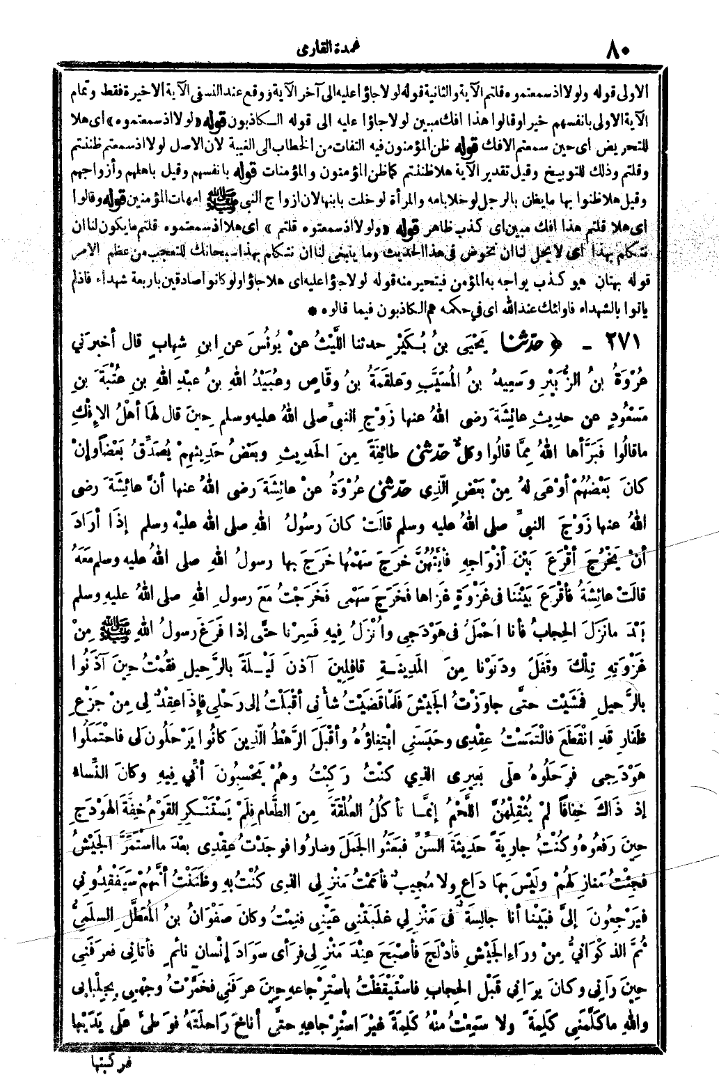0574 - حدَّثنا يَحْيَى بنُ بُكَيْرٍ حَدثنَا اللَّيْثُ عنْ يُونُسَ عنِ ابنِ شِهابٍ قَالَ أخبرَني عُرْوَةُ بنُ الزُّبَيْرِ وسَعِيدُ بنُ المُسَيَّبِ وعَلْقَمَةُ بنُ وقّاصٍ وعُبَيْدُ الله بنُ عَبْدِ الله بنِ عُتْبَةَ بنِ مَسْعُودٍ عَن حدِيثِ عائِشَةَ رَضِي الله عَنْهَا زَوْجِ النبيِّ صلى الله عَلَيْهِ وَسلم حِينَ قَالَ لَها أهْلُ الإفكِ مَا قالُوا فَبَرَّأها الله مِمَّا قالُوا وكلٌّ حدّثني طائِفَةً مِنَ الحَدِيثِ وبَعْضُ حَدِيثِهِمْ يُصَدِّقُ بَعْضاً وإنْ كانَ بَعْضُهُمْ أوْعَى لَهُ مِنْ بَعْضِ الَّذِي حدّثني عُرْوَةُ عَنْ عائِشَةَ رَضِي الله عَنْهَا أنَّ عائِشَةَ رَضِي الله عَنْهَا زَوْجَ النبيِّ صلى الله عَلَيْهِ وَسلم قالتْ كانَ رسُولُ الله صلى الله عَلَيْهِ وَسلم إذَا أرَادَ أنْ يَخْرُجَ أقْرَعَ بَيْنَ أزْوَاجِهِ فأيَّتُهُنَّ خَرَجَ سَهْمُها خَرَجَ بهَا رسولُ الله صلى الله عَلَيْهِ وَسلم مَعَهُ قالَتْ عائِشَةُ فأقْرَعَ بَيْنَنَا فِي غَزْوَةٍ غَزاها فَخَرَجَ سَهْمي فَخَرَجْتُ مَعَ رسولِ الله صلى الله عَلَيْهِ وَسلم بَعْدَ مَا نَزَلَ الحِجابُ فَأَنا أحْمَلُ فِي هَوْدَجِي وأُنْزَلُ فِيهِ فَسِرْنا حَتَّى إِذا فَرَغَ رَسُولُ الله صلى الله عَلَيْهِ وَسلم مِنْ غَزْوَتِهِ تِلْكَ وقَفَلَ ودَنَوْنا مِنَ المَدِينَةِ قافِلِينَ آذنَ لَيْلَةً بالرَّحِيلِ فقُمْتُ حِينَ آذَنُوا بالرَّحِيلِ فَمَشَيْت حَتَّى جاوَزْتُ الجَيْشَ فَلَمّا قَضَيْتُ شأْنِي أقْبَلْتُ إِلَى رَحْلِي فإِذَا عِقْدٌ لِي مِنْ جَزْعِ ظَفارِ قَدِ انْقَطَعَ فالْتَمَسْتُ عِقْدِي وحَبَسَنِي ابْتِغاؤُهُ وأقْبَلَ الرَّهْطُ الَّذِينَ كانُوا يَرْحَلُونَ لي فاحْتَمَلُوا هَوْدَجِي فَرَحَلُوهُ عَلَى بَعِيرِي الَّذِي كُنْتُ رَكِبْتُ وهُمْ يَحْسِبُونَ أنِّي فِيهِ وكانَ النِّساءُ إِذْ ذَاك خِفافاً لَمْ يُثْقِلْهُنَّ اللَّحْمُ إنَّما تأكُلُ العُلْقَةَ مِنَ الطَّعامِ فلَمْ يَسْتَنْكِرِ القَوْمُ خِفَّةَ الهَوْدَجِ حِينَ رَفَعُوهُ وكُنْتُ جارِيَةً حَدِيثَةَ السِّنِّ فَبَعَثُوا الجَمَلَ وسارُوا فوجَدْتُ عِقْدِي بَعْدَ مَا اسْتَمَرَّ الجَيْشُ فجِئْتُ مَنازِلَهُمْ وَلَيْسَ بِهَا دَاعٍ وَلَا مُجِيبٌ فأمَمْتُ مَنْزِلِي الَّذِي كُنْتُ بِهِ وَظَنَنْتُ أنَّهُمْ سَيَفْقِدُونِي فَيَرْجِعُونَ إليَّ فَبَيْنا أَنا جالِسَةٌ فِي مَنْزِلِي غَلَبَتْنِي عَيْنِي فَنِمْتُ وكانَ صَفْوَانُ بنُ المُعَطَّلِ السلَمِيُّ ثُمَّ الذكْوَانيُّ مِنْ ورَاءِ الجَيْشِ فأدْلَجَ فأصْبَحَ عِنْدَ مَنْزِلِي فَرَأى سَوَادَ إنْسانٍ نائِمٍ فَأَتَانِي فَعَرَفَنِي حِينَ رَآنِي وكانَ يَرَانِي قَبْلَ الحِجابِ فاسْتَيْقَظْتُ باسْتِرْجاعِهِ حِينَ عَرَفَنِي فَخَمَّرْتُ وَجْهِي بِجِلْبابي وَالله مَا كَلَّمَنِي كَلِمَةً وَلَا سَمِعْتُ مِنْهُ كَلِمَةً غَيْرَ اسْتِرْجَاعِهِ حَتَّى أناخَ رَاحِلَتَهُ فَوَطىءَ عَلَى يَدَيْها