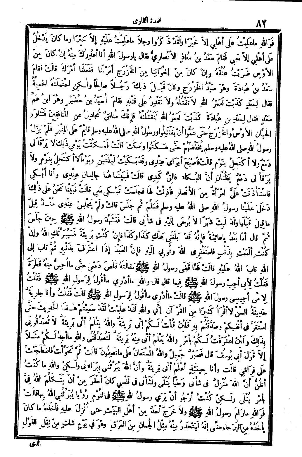 فوَاللَّه مَا عَلِمْتُ عَلَى أهْلِي إلاّ خَيْراً وَلَقَدْ ذَكَرُوا رجلا مَا عَلِمْتُ عَلَيْهِ إلاّ خَيْراً وَمَا كانَ يَدْخُلُ عَلَى أهْلِي إلاّ مَعِي فَقامَ سَعْدُ بنُ مُعاذٍ الأنصارِيُّ فَقَالَ يَا رسولُ الله أَنا أعْذِرُكَ مِنْهُ إنْ كانَ مِنَ الأوْسِ ضَرَبْتُ عُنُقَهُ وإنْ كانَ مِنْ إخْوَانِنا مِنَ الخَزْرَجِ أمَرْتَنا فَفَعَلْنا أمْرَكَ قالَتْ فقامَ سَعْدُ بنُ عُبادَةَ وَهْوَ سَيِّدُ الخَزْرَجِ وكانَ قَبْلَ ذالِكَ رَجُلاً صالِحاً ولاكِنِ احْتَمَلَتْهُ الحَمِيَّةُ فَقَالَ لِسَعْدٍ كَذَبْتَ لَعَمْرُ الله لاَ تَقْتُلُهُ ولاَ تَقْدِرُ عَلَى قَتله فَقَامَ أُسَيْدُ بنُ حُضَيْرٍ وهُوَ ابنُ عَمِّ سَعْدٍ فَقَالَ لِسَعْدِ بنِ عُبادَةَ كَذَبْتَ لَعَمْرُ الله لَنَقْتُلَنَّهُ فإنَّكَ مُنافقٌ تُجادِلُ عَنِ المُناقِقِينَ فَتَثاوَر الحَيَّانِ الأوْسُ والخَزْرَجُ حَتّى هَمُّوا أنْ يَقْتَتِلُوا ورسُولُ الله صلى الله عَلَيْهِ وَسلم قائِمٌ عَلَى المِنْبَرِ فَلَمْ يَزَلْ رسولُ الله صلى الله عَلَيْهِ وَسلم يُخَفِّضُهُمْ حَتَّى سَكَتُوا وَسَكَتَ قالَتْ فَمَكُثْتُ يَوْمِي ذالِكَ لَا يَرْقَأ لي دَمْعٌ وَلَا أكْتَحِلُ بِنَوْمِ قالَتْ فأصْبَحَ أبَوَايَ عِنْدِي وقَدْ بَكَيْتُ لَيْلَتَيْنِ وَيَوْماً لَا أكْتَحِلُ بِنَوْمٍ وَلاَ يَرْقأُ لي دَمْعٌ يَظُنَّانِ أنَّ البُكاءَ فالِقٌ كَبِدِي قالَتْ فَبَيْنَما هُما جالِسان عِنْدِي وَأَنا أبْكِي فاسْتَأْذَنَتْ عَلَيَّ امْرَأةٌ مِنَ الأنْصارِ فأذِنْتُ لَها فَجَلَسَتْ تَبْكِي مَعِي قالَتْ فَبَيْنا نَحْنُ عَلَى ذالِكَ دَخَلَ عَلَيْنا رسولُ الله صلى الله عَلَيْهِ وَسلم فَسَلَّمَ ثُمَّ جَلَسَ قالتْ ولَمْ يَجْلِسْ عِنْدِي مُنْذُ قِيلَ مَا قِيلَ قَبْلَها وَقَدْ لَبِثَ شَهْراً لاَ يُوحَى إلَيْهِ فِي شأْنِي قالَتْ فَتَشهَّدَ رسولُ الله صلى الله عَلَيْهِ وَسلم حِينَ جَلَسَ ثُمَّ قَالَ أمّا بَعْدُ يَا عائِشَةُ فإنَّهُ قَدْ بَلَغَنِي عَنْكِ كَذَا وكَذَا فإنْ كُنْتِ بَرِيئَةً فَسَيُبَرِّئُكِ الله وإنْ كُنْتِ ألْمَمْتِ بِذَنْبٍ فاسْتَغْفِرِي الله وتُوبِي إلَيْهِ فإِنَّ العَبْدَ إذَا اعْتَرَفَ بِذَنْبِهِ ثُمَّ تابَ إِلَى الله تابَ الله عَلَيْهِ قالَتْ فَلَمَّا قَضَى رسولُ الله صلى الله عَلَيْهِ وَسلم مقالَتَهُ قَلَصَ دَمْعِي حَتَّى مَا أُحِسُّ مِنْهُ قَطْرَةً فَقُلْتُ لأبِي أجِبْ رسولَ الله صلى الله عَلَيْهِ وَسلم فِيما قَالَ قَالَ وَالله مَا أدْرِي مَا أقُولُ لِرَسُولِ الله صلى الله عَلَيْهِ وَسلم فَقُلْتُ لأمِّي أجِيبِي رسولَ الله صلى الله عَلَيْهِ وَسلم قالَتْ مَا أدْرِي مَا أقُولُ لِرَسُولِ الله صلى الله عَلَيْهِ وَسلم قالَتْ فَقُلْتُ وَأَنا جارِيَةٌ حَدِيثَةُ السِّنِّ لَا أقْرَأُ كَثِيراً مِنَ القُرْآنِ إنِّي وَالله لَقَدْ عَلِمْتُ لَقَدْ سَمِعْتُمْ هاذَا الحَدِيثَ حَتَّى اسْتَقَرَّ فِي أنْفسِكمْ وصَدَّقْتُمْ بِهِ فَلِئِنْ قُلْتُ لَكُمْ إنِّي بَرِيئَةٌ وَالله يَعْلَمُ أنِّي بَرِيئَةٌ لاَ تُصَدِّقُونِي بِذالِكَ وَلِئَنْ اعْتَرَفْتُ لَكُمْ بأمْرٍ وَالله يَعْلَمُ أنِّي مِنْهُ بَرِيئَةٌ لَتُصَدِّقُنِي وَالله مَا أجِدُ لَكُمْ مَثَلاً إلاّ قَوْلَ أبي يُوسُفَ قَالَ: {فَصَبْرٌ جَمِيلٌ وَالله المُسْتَعانُ عَلَى مَا تَصِفُونَ} (يُوسُف: 81) قالَتْ: ثُمَّ تَحَوَّلْتُ فاضْطَجَعْتُ عَلَى فِرَاشِي قالَتْ وَأَنا حِنَئِذٍ أعْلَمُ أنِّي بَرِيئَةٌ وأنَّ الله يُبَرِّئُني بِبَرَاءَتِي ولاكِنْ وَالله مَا كُنْتُ أظُنُّ أنَّ الله مُنْزِلٌ فِي شأْني وَحْياً يُتْلَى ولَشَأْني فِي نَفْسي كانَ أحْقَرَ مِنْ أنْ يَتَكَلَّمَ الله فِيَّ بأمْر يُتْلَى ولاكِنْ كُنْتُ أرْجُو أنْ يَرَى رسولُ الله صلى الله عَلَيْهِ وَسلم فِي النَّوْمِ رُؤْيا يُبَرِّئُنِي الله بِها قالَتْ فَوَالله مَا رَامَ رسولُ