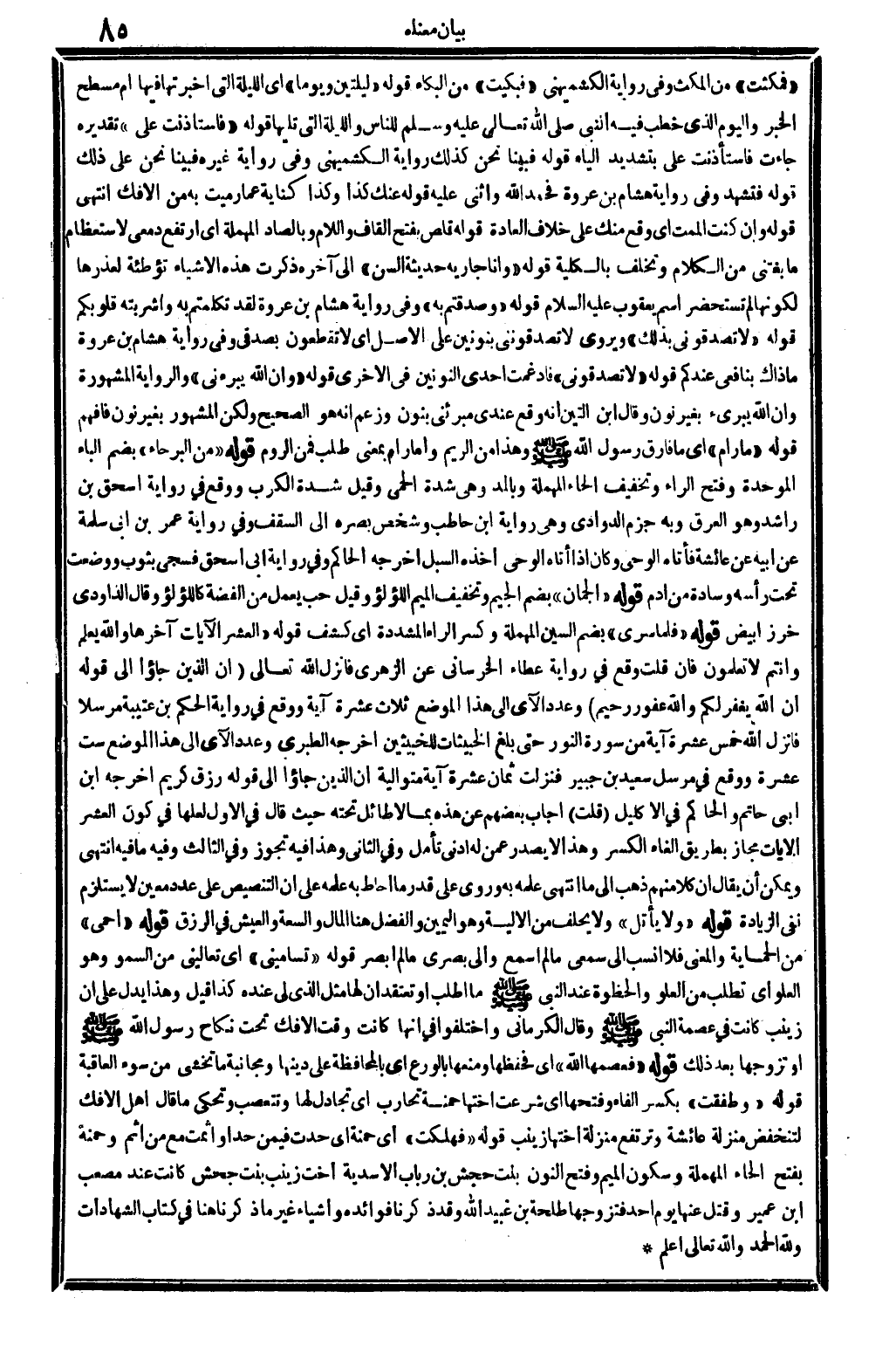 إِلَى آخِره، ذكرت هَذِه الْأَشْيَاء تَوْطِئَة لعذرها لكَونهَا لم تستحضر إسم يَعْقُوب عَلَيْهِ السَّلَام. قَوْله: (وصدقتم بِهِ) ، وَفِي رِوَايَة هِشَام بن عُرْوَة: لقد تكلمتم بِهِ وأشربته قُلُوبكُمْ. قَوْله: (لَا تصدقوني بذلك) ، ويروى: لَا تصدقونني، بنونين على الأَصْل، أَي: لَا تقطعون بصدقي، وَفِي رِوَايَة هِشَام بن عُرْوَة: مَا ذَاك بنافعي عنْدكُمْ. قَوْله: (لَا تصدقوني) ، فأدغمت إِحْدَى النونين فِي الْأُخْرَى. قَوْله: (وَإِن الله يبرءني) ، وَالرِّوَايَة الْمَشْهُورَة وَأَن الله يبرىء، بِغَيْر نون، وَقَالَ ابْن التِّين: إِنَّه وَقع عِنْدِي: مبرئني، بنُون وَزعم أَنه هُوَ الصَّحِيح، وَلَكِن الْمَشْهُور بِغَيْر نون فَافْهَم. قَوْله: (مَا رام) ، أَي: مَا فَارق (رَسُول الله صلى الله عَلَيْهِ وَسلم) وَهَذَا من الريم، وَأما رام، بِمَعْنى: طلب فَمن الرّوم. قَوْله: (من البرحاء) ، بِضَم الْبَاء الْمُوَحدَة وَفتح الرَّاء وَتَخْفِيف الْحَاء الْمُهْملَة، وبالمد وَهِي: شدَّة الْحمى، وَقيل: شدَّة الكرب، وَوَقع فِي رِوَايَة إِسْحَاق بن رَاشد: وَهُوَ الْعرق، وَبِه جزم الدوادي، وَهِي رِوَايَة ابْن حَاطِب وشخص بَصَره إِلَى السّقف، وَفِي رِوَايَة عمر بن أبي سَلمَة عَن أَبِيه عَن عَائِشَة: فَأَتَاهُ الْوَحْي، وَكَانَ إِذا أَتَاهُ الْوَحْي أَخذه السبل، أخرجه الْحَاكِم وَفِي رِوَايَة أبي إِسْحَاق: فسجى بِثَوْب، وَوضعت تَحت رَأسه وسَادَة من أَدَم. قَوْله: (الجمان) ، بِضَم الْجِيم وَتَخْفِيف الْمِيم: اللُّؤْلُؤ، وَقيل: حب يعْمل من الْفضة كَاللُّؤْلُؤِ، وَقَالَ الدَّاودِيّ: خرز أَبيض. قَوْله: (فَلَمَّا سري) ، بِضَم السِّين الْمُهْملَة وَكسر الرَّاء الْمُشَدّدَة أَي: كشف. قَوْله: (الْعشْر الْآيَات) آخرهَا: (وَالله يعلم وَأَنْتُم لَا تعلمُونَ) فَإِن قلت: وَقع فِي رِوَايَة عَطاء الخرساني عَن الزُّهْرِيّ، فَأنْزل الله تَعَالَى: {إِن الَّذين جاؤوا} (النُّور: 91) إِلَى قَوْله: {أَن يغْفر الله لكم وَالله غَفُور رَحِيم} (النُّور: 11 22) . وَعدد الْآي إِلَى هَذَا الْموضع ثَلَاث عشرَة آيَة، وَوَقع فِي رِوَايَة الحكم بن عتيبة مُرْسلا: فَأنْزل الله خمس عشرَة آيَة من سُورَة النُّور حَتَّى بلغ {الخبيثات للخبيثين} (النُّور: 62) أخرجه الطَّبَرِيّ، وَعدد الْآي إِلَى هَذَا الْموضع سِتّ عشرَة، وَوَقع فِي: (مُرْسل سعيد بن جُبَير) . فَنزلت ثَمَان عشرَة آيَة مُتَوَالِيَة: {إِن الَّذين جاؤوا} إِلَى قَوْله: {رزق كريم} (النُّور: 11 62) أخرجه ابْن أبي حَاتِم، وَالْحَاكِم فِي (الإكليل) قلت: أجَاب بَعضهم عَن هَذِه بِمَا لَا طائل تَحْتَهُ حَيْثُ قَالَ: فِي الأول: لَعَلَّهَا فِي كَون الْعشْر الْآيَات مجَاز بطرِيق إِلْغَاء الْكسر، وَهَذَا لَا يصدر عَمَّن لَهُ أدنى تَأمل. وَفِي الثَّانِي: وَهَذَا فِيهِ تجوز. وَفِي الثَّالِث: وَفِيه مَا فِيهِ. انْتهى. وَيُمكن أَن يُقَال: إِن كلا مِنْهُم ذهب إِلَى مَا انْتهى علمه بِهِ، وروى على قدر مَا أحَاط بِهِ علمه، على أَن التَّنْصِيص على عدد معِين لَا يسْتَلْزم نفي الزِّيَادَة. قَوْله: (وَلَا يَأْتَلِ) ، وَلَا يحلف من الألية وَهُوَ الْيَمين (وَالْفضل) هُنَا المَال وَالسعَة والعيش فِي الرزق. قَوْله: (أحمي) من الحماية، وَالْمعْنَى: فَلَا أنسب إِلَى سَمْعِي مَا لم أسمع وَإِلَى بَصرِي مَا لم أبْصر. قَوْله: (تساميني) ، أَي: تعاليني من السمو وَهُوَ الْعُلُوّ أَي: تطلب من الْعُلُوّ والحظوة عِنْد النَّبِي صلى الله عَلَيْهِ وَسلم مَا أطلب، أَو تعتقد أَن لَهَا مثل الَّذِي لي عِنْده، كَذَا قيل، وَهَذَا يدل على أَن زَيْنَب كَانَت فِي عصمَة النَّبِي صلى الله عَلَيْهِ وَسلم. وَقَالَ الْكرْمَانِي: وَاخْتلفُوا فِي أَنَّهَا كَانَت وَقت الْإِفْك تَحت نِكَاح رَسُول الله صلى الله عَلَيْهِ وَسلم، أَو تزَوجهَا بعد ذَلِك. قَوْله: (فعصمها الله) أَي: فحفظها ومنعها بالورع أَي: بالمحافظة على دينهَا ومجانب