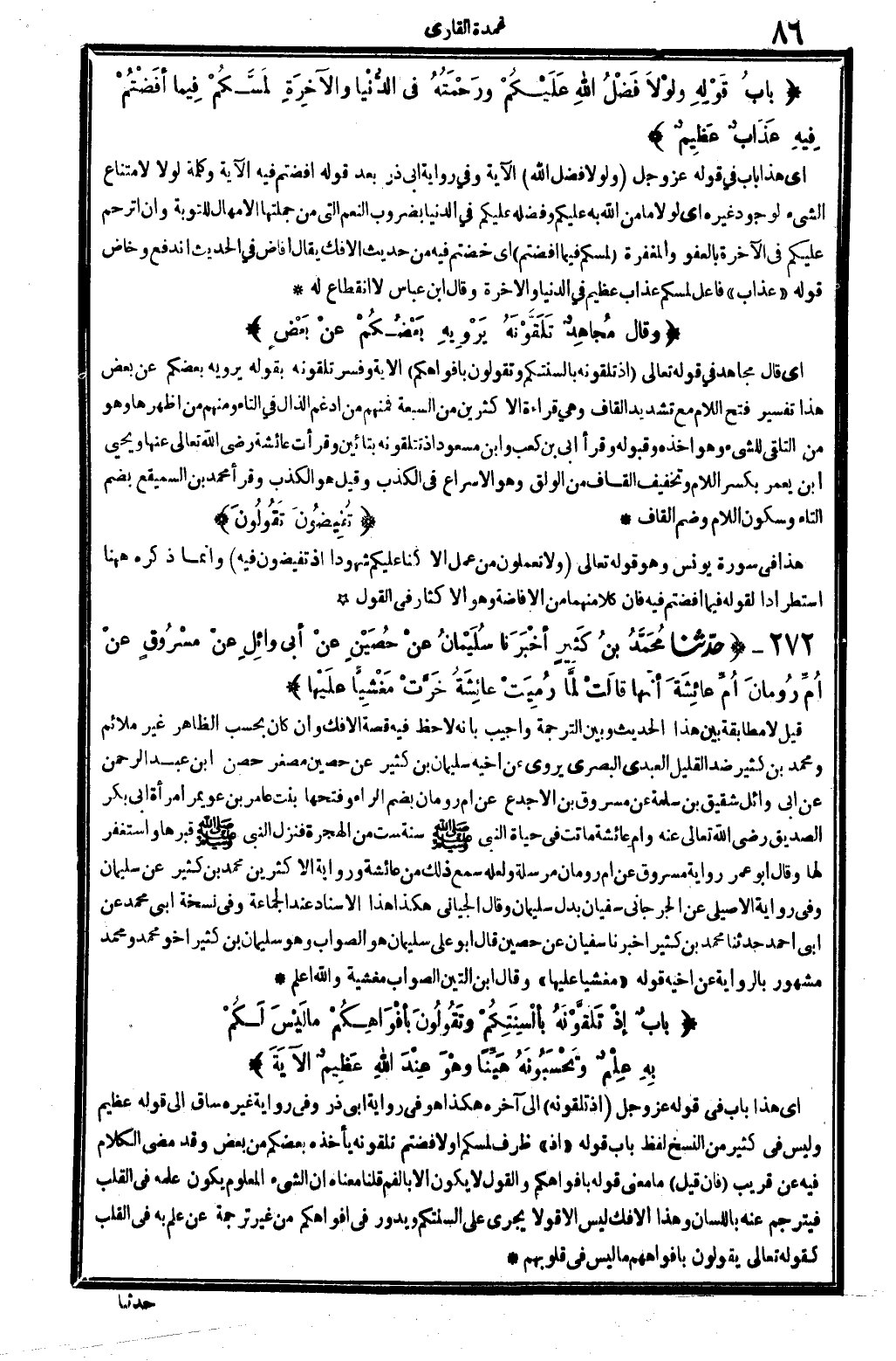 أَي: هَذَا بَاب فِي قَوْله عز وَجل: {وَلَوْلَا فضل الله} الْآيَة، وَفِي رِوَايَة أبي ذَر بعد قَوْله: {أَفَضْتُم فِيهِ} الْآيَة، وَكلمَة: لَوْلَا، لِامْتِنَاع الشَّيْء لوُجُود غَيره أَي: لَوْلَا مَا منَّ الله بِهِ عَلَيْكُم وفضله عَلَيْكُم فِي الدُّنْيَا بضروب النعم الَّتِي من جُمْلَتهَا الْإِمْهَال للتَّوْبَة، وَأَن أترحم عَلَيْكُم فِي الْآخِرَة بِالْعَفو وَالْمَغْفِرَة {لمسكم فِيمَا أَفَضْتُم} أَي: خضتم فِيهِ من حَدِيث الْإِفْك، يُقَال: أَفَاضَ فِي الحَدِيث انْدفع وخاض قَوْله: (عَذَاب) فَاعل: {لمسكم عَذَاب عَظِيم} فِي الدُّنْيَا وَالْآخِرَة، وَقَالَ ابْن عَبَّاس: لَا انْقِطَاع لَهُ.