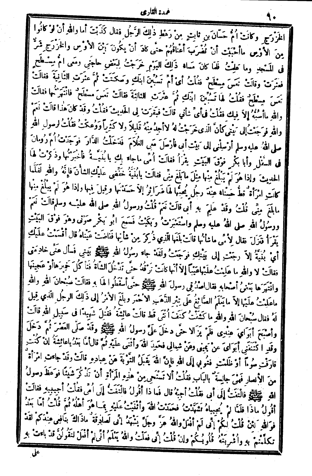 الخَزْرَجِ وكانتْ أُمُّ حَسّانَ بنِ ثابِتٍ مِنْ رَهْطِ ذالِكَ الرَّجُلِ فَقَالَ كَذَبْتَ أما وَالله أنْ لَوْ كانُوا مِنَ الأوْسِ مَا أحْبَبْت أنْ تُضْرَبَ أعْناقُهُمْ حَتَّى كادَ أنْ يكُونَ بَيْنَ الأوْسِ والخَزْرَجِ شَرٌّ فِي المَسْجدِ وَمَا عَلِمْتُ فَلَمّا كَانَ مَساءُ ذالِكَ اليَوْمِ خَرَجْتُ لِبَعْضِ حاجَتِي ومَعِي أُمُّ مِسْطَحٍ فعَثَرَتْ وقالَتْ تَعَسَ مِسْطَحٌ فقُلْتُ أيْ أمِّ تَسُبِّينَ ابنَكِ وسَكَتَتْ ثُمَّ عَثَرَتِ الثّانِيَةَ فقالَتْ تَعَسَ مِسْطَحٌ فَقُلْتُ لَها تَسُبِّينَ ابْنَكِ ثُمَّ عَثَرَتِ الثالِثَةَ فقالَتْ تَعَسَ مَسْطَحٌ فانْتَهَرْتُها فقالَتْ وَالله مَا أسُبُّهُ إلاّ فِيكِ فقُلْتُ فِي أيِّ شأني قالَتْ فَبَقَرَتْ لِي الحَدِيثَ فَقُلْتُ وَقَدْ كانَ هاذَا قالَتْ نَعَمْ وَالله فَرَجَعْتُ إِلَى بَيْتي كَأنَّ الَّذِي خَرَجْتُ لَهُ لَا أجِدُ مِنْهُ قَلِيلاً وَلَا كَثِيراً وَوُعكْتُ فَقُلْتُ لرسولِ الله صلى الله عَلَيْهِ وَسلم أرْسِلْني إِلَى بَيْتِ أبي فأرْسَلَ مَعِي الغُلاَمَ فَدَخَلْتُ الدَّارَ فَوَجَدْتُ أُمَّ رُومانَ فِي السُّفْلِ وَأَبا بَكْرٍ فَوْقَ البَيْتِ يَقْرَأُ فقالَتْ أُمِّي مَا جاءَ بِكِ يَا بُنَيَّةُ فأخْبَرْتُها وَذَكَرْتُ لَها الحدِيثَ وَإِذا هُوَ لَمْ يَبْلُغْ مِنْها مِثْلَ مَا بَلَغَ مِنِّي فقالَتْ يَا بُنَيَّةُ خَفِّضِي عَلَيِكِ الشأْنَ فإنَّهُ وَالله لَقَلَّما كانَتِ امْرَأةٌ قَطُّ حَسْناءُ عِنْدَ رَجُلٍ يُحِبُّها لَها ضَرَائِرُ إلاّ حَسَدْنَها وقِيلَ فِيها وَإِذا هُوَ لَمْ يَبْلُغْ مِنْها مَا بَلَغَ مِنِّي قُلْتُ وَقَدْ عَلِمَ بِهِ أبي قالَتْ نَعَمْ قُلْتُ ورسولُ الله صلى الله عَلَيْهِ وَسلم قالَتْ نَعَمْ ورسُولُ الله صلى الله عَلَيْهِ وَسلم واسْتَعْبَرْتُ وَبَكَيْتُ فَسَمَعَ أبُو بَكْرٍ صَوْتِي وهْوَ فَوْقَ البَيْتِ يَقْرَأُ فَنَزَلَ فَقَالَ لأمِّي مَا شأنُها قالَتْ بَلَغَها الَّذِي ذُكِرَ مِنْ شأنِها فَفاضَتْ عَيْناهُ قَالَ أقْسَمْتُ عَلَيْكِ أيْ بُنَيَّةُ إلاّ رجَعْتِ إِلَى بَيْتِكِ فَرَجَعْتُ وَلَقَدْ جاءَ رسُولُ الله صلى الله عَلَيْهِ وَسلم بَيْتِي فَسَأل عَنِّي خادِمَتي فقالَتْ لَا وَالله مَا عَلِمْتُ عَلَيْها عَيْباً إلاّ أنّها كانَتْ تَرْقُدُ حَتَّى تَدْخُلَ الشّاةُ فَتَأكُلَ خَمِيرَها أوْ عَجِينَها وانْتَهَرَها بَعْضُ أصْحابِهِ فَقَالَ اصْدُقِي رسولَ الله صلى الله عَلَيْهِ وَسلم حَتَّى أسْقَطُوا لَها بِهِ فقالَتْ سُبْحانَ الله وَالله مَا عَلِمْتُ عَلَيْها إلاّ مَا يَعْلَمُ الصَّائِغُ عَلَى تِبْرِ الذَّهَبِ الأحْمَر وَبَلَغَ الأمْرُ إِلَى ذَلِكَ الرجُلِ الَّذِي قِيلَ لَهُ فَقَالَ سُبْحانَ الله وَالله مَا كَشَفْتُ كَنَفَ أُنْثَى قَط قالَتْ عائِشَةُ فقُتِلَ شَهِيداً فِي سَبِيلِ الله قالَتْ وأصْبَحَ أبَوَايَ عِنْدِي فَلَمْ يَزَالا حَتَّى دَخَلَ عَلَيَّ رسولُ الله صلى الله عَلَيْهِ وَسلم وَقَدْ صَلَّى العَصْرَ ثُمَّ دَخَلَ وقَدِ اكْتَنَفَنِي أبَوَايَ عَنْ يَمِينِي وعَنْ شِمالِي فَحَمِدَ الله وأثْنَى عَلَيْهِ ثُمَّ قَالَ أمَّا بَعْدُ يَا عائِشَةُ إنْ كُنْتِ قارَفْتِ سُوءاً أوْ ظَلمْتِ فتُوبِي إلَى الله فإِنَّ الله يَقْبَلُ التَّوْبَةَ عَنْ عِبادِهِ قالَتْ وَقَدْ جاءَتِ امْرَأةٌ مِنَ الأنصارِ فَهْيَ جالِسَةٌ بالبَابِ فَقُلْتُ أَلا تَسْتَحِي مِنْ هاذِهِ المَرْأةِ أنْ تَذْكُرَ شَيْئاً فَوَعَظَ رسولُ الله صلى الله عَلَيْهِ وَسلم فالْتَفَتُّ إلَى أبي فَقُلْتُ أجِبْهُ قَالَ فَماذا أقُولُ فالْتَفَتُّ إلَى أُمِّي فَقُلْتُ أجِيبِيهِ فقالَتْ أقُولُ ماذَا فَلَمَّا لَمْ يُجِيباهُ تَشَهَّدْتُ فَحَمَدْتُ الله وأثْنَيْتُ عَلَيْهِ بِمَا هُوَ أهْلُهُ ثُمَّ قُلْتُ أمّا بَعْدُ فوَالله لَئِنْ قُلْتُ لَكُمْ إنِّي لَمْ أفْعَلْ وَالله عَزَّ وج