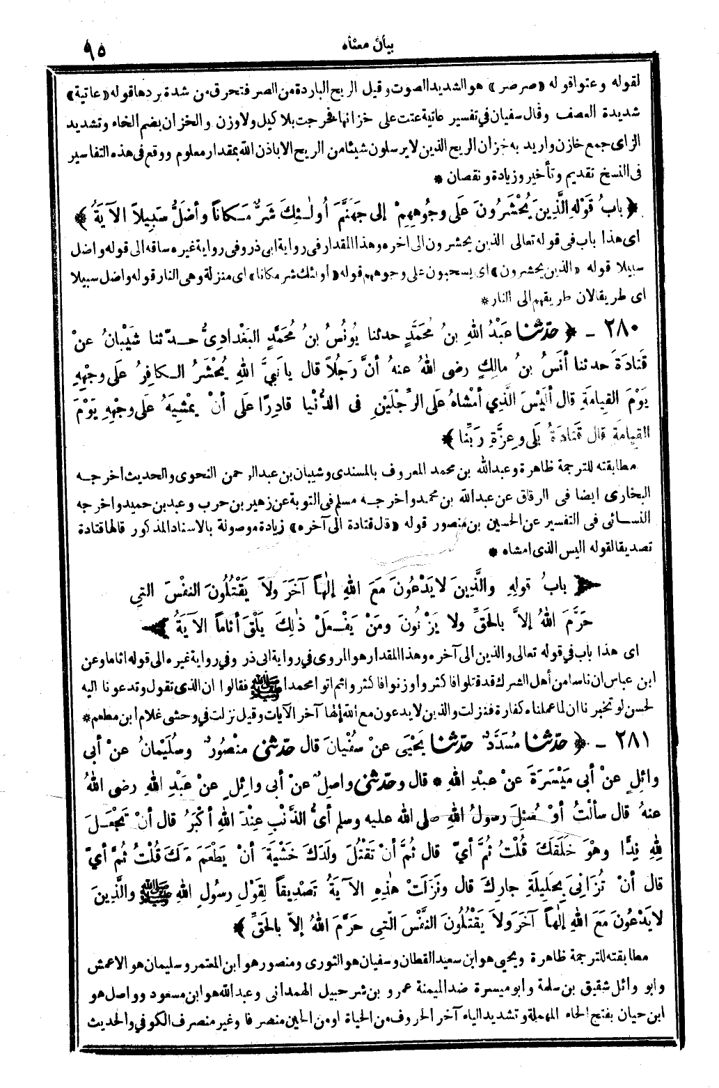 أَي: هَذَا بَاب فِي قَوْله تَعَالَى: {الَّذين يحشرون} إِلَى آخِره، وَهَذَا الْمِقْدَار فِي رِوَايَة أبي ذَر، وَفِي رِوَايَة غَيره سَاقه إِلَى قَوْله: {وأضل سَبِيلا} . قَوْله: (الَّذين يحشرون) أَي: يسْحَبُونَ على وُجُوههم. قَوْله: (أُولَئِكَ مَكَانا) أَي: منزلَة وَهِي النَّار. قَوْله: (وأضل سَبِيلا) أَي: طَرِيقا، لِأَن طريقهم إِلَى النَّار.