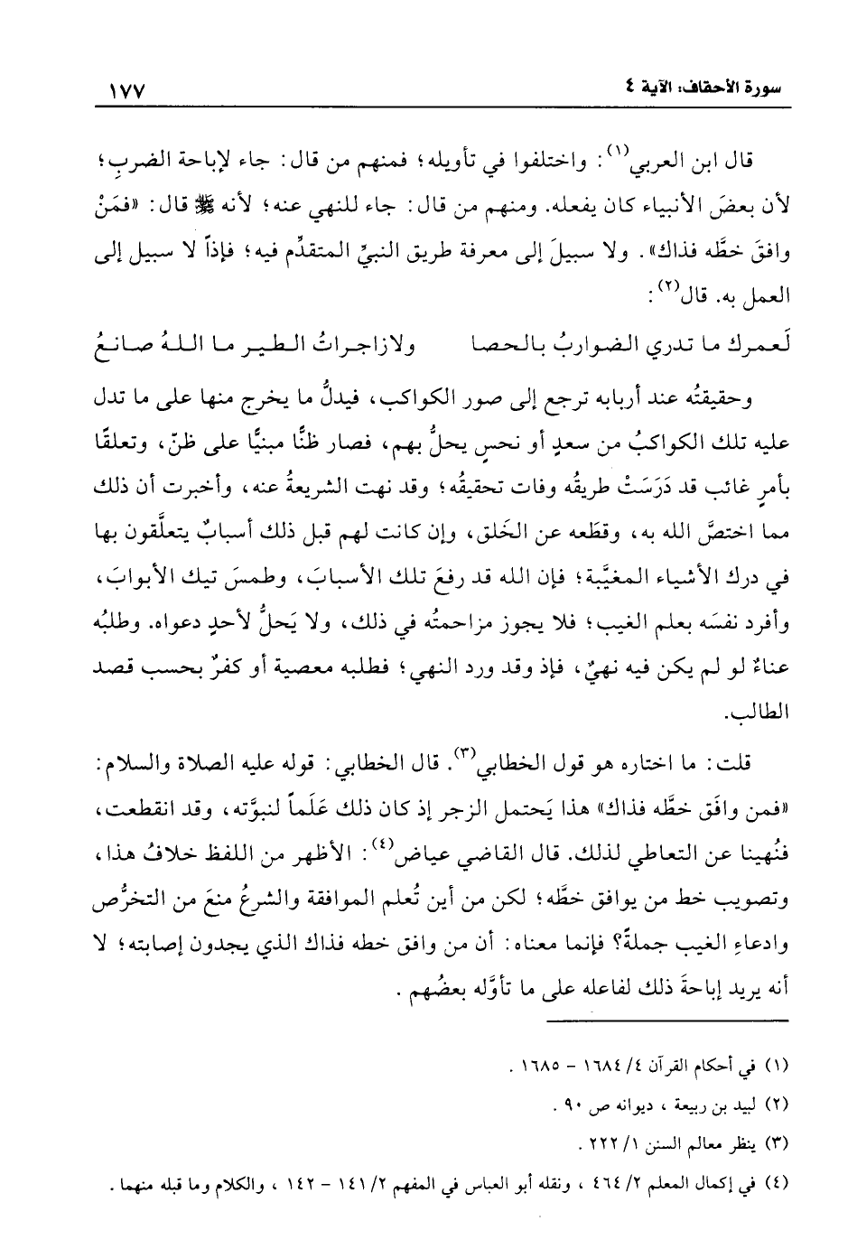 قَوْلُهُ تَعَالَى: (إِنَّ جَهَنَّمَ كانَتْ مِرْصاداً): مِفْعَالٌ من الرصد والرصد: كل شي كَانَ أَمَامَكَ. قَالَ الْحَسَنُ: إِنَّ عَلَى النَّارِ رَصَدًا، لَا يَدْخُلُ أَحَدٌ الْجَنَّةَ حَتَّى يَجْتَازَ عَلَيْهِ، فَمَنْ جَاءَ بِجَوَازٍ جَازَ، وَمَنْ لَمْ يَجِئْ بِجَوَازٍ حُبِسَ. وَعَنْ سُفْيَانَ رَضِيَ اللَّهُ عَنْهُ قَالَ: عَلَيْهَا ثَلَاثُ قَنَاطِرَ. وَقِيلَ مِرْصاداً ذَاتَ أَرْصَادٍ عَلَى النَّسَبِ، أَيْ تَرْصُدُ مَنْ يَمُرُّ بِهَا. وَقَالَ مُقَاتِلٌ: مَحْبِسًا. وَقِيلَ: طَرِيقًا وَمَمَرًّا، فَلَا سَبِيلَ إِلَى الْجَنَّةِ حَتَّى يَقْطَعَ جَهَنَّمَ. وَفِي الصِّحَاحِ: وَالْمِرْصَادُ: الطَّرِيقُ. وَذَكَرَ الْقُشَيْرِيُّ: أَنَّ الْمِرْصَادَ الْمَكَانُ الَّذِي يَرْصُدُ فِيهِ الْوَاحِدُ الْعَدُوَّ، نَحْوَ الْمِضْمَارِ: الْمَوْضِعُ الَّذِي تُضْمَرُ فِيهِ الْخَيْلُ. أَيْ هِيَ مُعَدَّةٌ لَهُمْ، فَالْمِرْصَادُ بِمَعْنَى الْمَحَلِّ، فَالْمَلَائِكَةُ يَرْصُدُونَ الْكُفَّارَ حَتَّى يَنْزِلُوا بِجَهَنَّمَ. وَذَكَرَ الْمَاوَرْدِيُّ عَنْ أَبِي سِنَانٍ «1» أَنَّهَا بِمَعْنَى رَاصِدَةً، تُجَازِيهِمْ بِأَفْعَالِهِمْ. وَفِي الصِّحَاحِ: الرَّاصِدُ الشَّيْءَ: الرَّاقِبُ لَهُ، تَقُولُ: رَصَدَهُ يَرْصُدُهُ رَصْدًا وَرَصَدًا، وَالتَّرَصُّدُ: التَّرَقُّبُ. وَالْمَرْصَدُ: مَوْضِعُ الرَّصَدِ. الْأَصْمَعِيُّ: رَصَدْتُهُ أَرْصُدُهُ: تَرَقَّبْتُهُ، وَأَرْصَدْتُهُ: أَعْدَدْتُ لَهُ. وَالْكِسَائِيُّ: مِثْلُهُ. قُلْتُ: فَجَهَنَّمُ مُعَدَّةٌ مُتَرَصِّدَةٌ، مُتَفَعِّلٌ مِنَ الرَّصَدِ وَهُوَ التَّرَقُّبُ، أَيْ هِيَ مُتَطَلِّعَةٌ لِمَنْ يَأْتِي. وَالْمِرْصَادُ مِفْعَالٌ مِنْ أَبْنِيَةِ الْمُبَالَغَةِ كَالْمِعْطَارِ وَالْمِغْيَارِ، فَكَأَنَّهُ يَكْثُرُ مِنْ جَهَنَّمَ انْتِظَارُ الْكُفَّارِ. (لِلطَّاغِينَ مَآباً) بَدَلٌ مِنْ قَوْلِهِ: مِرْصاداً وَالْمَآبُ: الْمَرْجِعُ، أَيْ مَرْجِعًا يَرْجِعُونَ إِلَيْهَا، يُقَالُ: آبَ يَئُوبُ أَوْبَةً: إِذَا رَجَعَ. وَقَالَ قَتَادَةُ: مَأْوًى وَمَنْزِلًا. وَالْمُرَادُ بِالطَّاغِينَ مَنْ طَغَى فِي دِينِهِ بِالْكُفْرِ، أو في دنياه بالظلم. قوله تعالى: (لابِثِينَ فِيها أَحْقاباً) أَيْ مَاكِثِينَ فِي النَّارِ مَا دَامَتِ الْأَحْقَابُ، وَهِيَ لَا تَنْقَطِعُ، فَكُلَّمَا مَضَى حُقُبٌ جَاءَ حُقُبٌ. وَالْحُقُبُ بِضَمَّتَيْنِ: الدَّهْرُ وَالْأَحْقَابُ الدُّهُورُ. وَالْحِقْبَةُ بِالْكَسْرِ: السَّنَةُ، وَالْجَمْعُ حِقَبٌ، قَالَ مُتَمِّمُ بْنُ نُوَيْرَةَ التَّمِيمِيُّ: