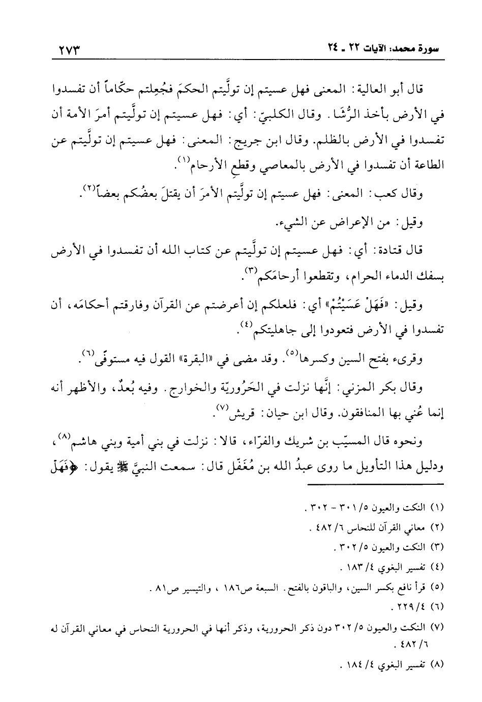 عَنْ عَاصِمٍ وَخَارِجَةَ عَنْ نَافِعٍ وَإِسْمَاعِيلَ الْمَكِّيِّ عَنِ ابْنِ كَثِيرٍ (وَيُصْلَى) بِضَمِّ الْيَاءِ وَإِسْكَانِ الصَّادِ وَفَتْحِ اللَّامِ مُخَفَّفًا، كَمَا قُرِئَ (وَسَيُصْلَوْنَ) بِضَمِّ الْيَاءِ، وَكَذَلِكَ فِي" الْغَاشِيَةِ" قَدْ قُرِئَ أَيْضًا: تَصْلى نَارًا وَهُمَا لُغَتَانِ صَلَى وَأَصْلَى، كَقَوْلِهِ:" نَزَلَ. وَأَنْزَلَ". (إِنَّهُ كانَ فِي أَهْلِهِ) أَيْ فِي الدُّنْيَا (مَسْرُوراً) قَالَ ابْنُ زَيْدٍ: وَصَفَ اللَّهُ أَهْلَ الْجَنَّةِ بِالْمَخَافَةِ وَالْحُزْنِ وَالْبُكَاءِ وَالشَّفَقَةِ فِي الدُّنْيَا فَأَعْقَبَهُمْ بِهِ النَّعِيمَ وَالسُّرُورَ فِي الْآخِرَةِ، وَقَرَأَ قَوْلَ اللَّهِ تَعَالَى: إِنَّا كُنَّا قَبْلُ فِي أَهْلِنا مُشْفِقِينَ فَمَنَّ اللَّهُ عَلَيْنا وَوَقانا عَذابَ السَّمُومِ. قَالَ: وَوَصَفَ أَهْلَ النَّارِ بِالسُّرُورِ فِي الدُّنْيَا وَالضَّحِكِ فِيهَا وَالتَّفَكُّهِ. فَقَالَ: إِنَّهُ كانَ فِي أَهْلِهِ مَسْرُوراً (إِنَّهُ ظَنَّ أَنْ لَنْ يَحُورَ) أَيْ لَنْ يَرْجِعَ حَيًّا مَبْعُوثًا فَيُحَاسَبُ، ثُمَّ يُثَابُ أَوْ يُعَاقَبُ. يُقَالُ: حَارَ يَحُورُ إِذَا رَجَعَ، قَالَ لَبِيدٌ: