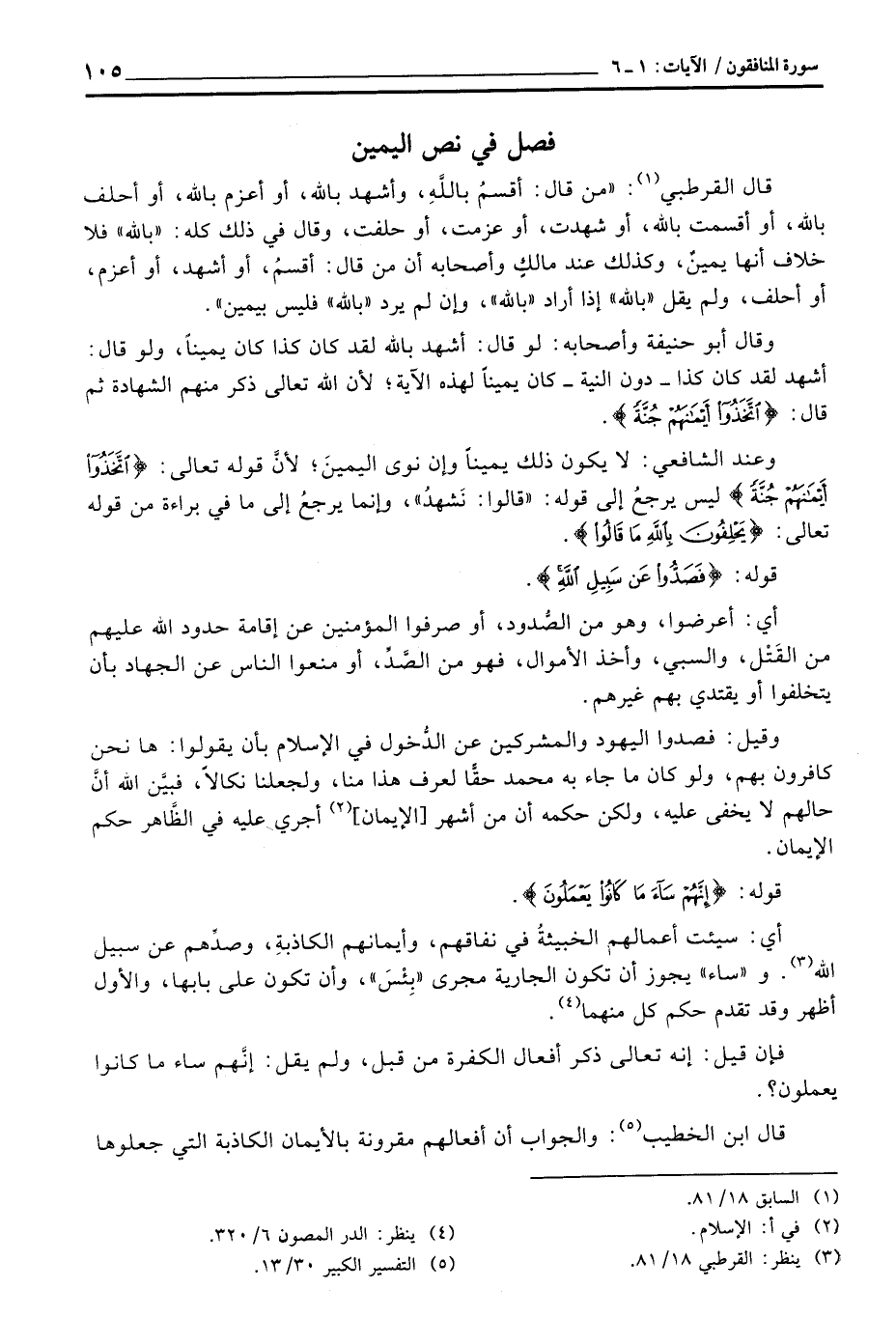 وعند الشافعي: لا يكون ذلك يميناً وإن نوى اليمينَ؛ لأنَّ قوله تعالى: {اتخذوا أَيْمَانَهُمْ جُنَّةً} ليس يرجعُ إلى قوله: «قالوا: نَشهدُ» ، وإنما يرجعُ إلى ما في براءة من قوله تعالى: {يَحْلِفُونَ بالله مَا قَالُواْ} .