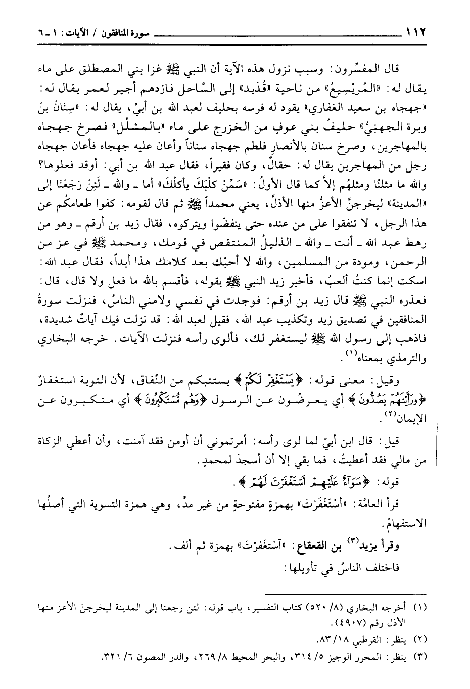 قال المفسِّرون: «وسبب نزول هذه الآية أن النبي صَلَّى اللَّهُ عَلَيْهِ وَسَلَّم َ غزا بني المصطلق على ماء يقال له:» المُريْسِيعُ «من ناحية» قُدَيد «إلى السَّاحل فازدهم أجير لعمر يقال له:» جهجاه بن سعيد الغفاري «يقود له فرسه بحليف لعبد الله بن أبيٍّ، يقال له:» سِنَانُ بنُ وبرة الجهنِيُّ «حليفُ بني عوفٍ من الخزرج على ماء» بالمشلِّل «فصرخ جهجاه بالمهاجرين، وصرخ سنان بالأنصار فلطم جهجاه سناناً وأعان عليه جهجاه فأعان جهجاه رجل من المهاجرين يقال له: حقالٌ، وكان فقيراً، فقال عبد الله بن أبي: أوقد فعلوها؟ والله ما مثلنُا ومثلهُم إلاَّ كما قال الأولُ:» سَمِّنْ كلْبَكَ يأكلْكَ «أما - والله - لَئِنْ رَجَعْنَا إلى» المدينة «ليخرجنَّ الأعزُّ منها الأذلَّ، يعني محمداً صَلَّى اللَّهُ عَلَيْهِ وَسَلَّم َ ثم قال لقومه: كفوا طعامكُم عن هذا الرجل، لا تنفقوا على من عنده حتى ينفضّوا ويتركوه، فقال زيد بن أرقم - وهو من رهط عبد الله - أنت - والله - الذليلُ المنتقص في قومك، ومحمد صَلَّى اللَّهُ عَلَيْهِ وَسَلَّم َ في عز من الرحمن، ومودة من المسلمين، والله لا أحبّك بعد كلامك هذا أبداً، فقال عبد الله: اسكت إنما كنتُ ألعبُ، فأخبر زيد النبي صَلَّى اللَّهُ عَلَيْهِ وَسَلَّم َ بقوله، فأقسم بالله ما فعل ولا قال، قال: فعذره النبي صَلَّى اللَّهُ عَلَيْهِ وَسَلَّم َ قال زيد بن أرقم: فوجدت في نفسي ولامني الناسُ، فنزلت سورةُ المنافقين في تصديق زيد وتكذيب عبد الله، فقيل لعبد الله: قد نزلت فيك آياتٌ شديدة، فاذهب إلى رسول الله صَلَّى اللَّهُ عَلَيْهِ وَسَلَّم َ ليستغفر لك، فألوى رأسه» فنزلت الآيات. خرجه البخاري والترمذي بمعناه.