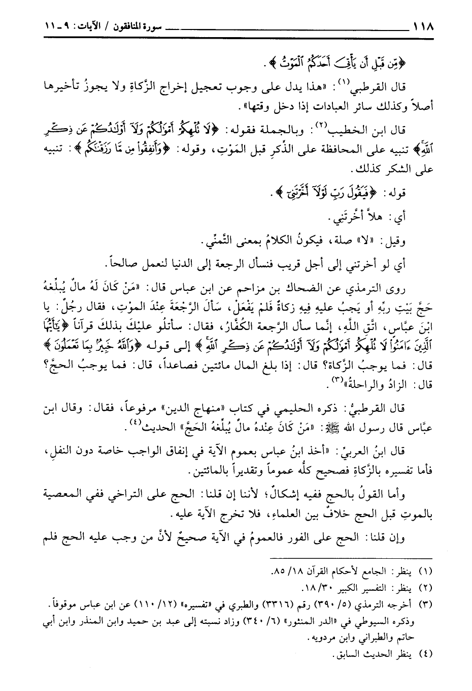 روى الترمذي عن الضحاك بن مزاحم عن ابن عباس قال: «مَنْ كَانَ لَهُ مالٌ يُبلِّغهُ حَجَّ بَيْتِ ربِّهِ أو يَجبُ عليهِ فِيهِ زكاةٌ فَلمْ يَفْعَلْ، سَألَ الرَّجْعَةَ عِنْدَ الموْتِ، فقال رجُلٌ: يا ابْنَ عبَّاسٍ، اتَّق اللَّهِ، إنَّما سأل الرَّجعة الكُفَّارُ، فقال: سأتلُو عليْكَ بذلك قرآناً {يا أيها الذين آمَنُواْ لاَ تُلْهِكُمْ أَمْوَالُكُمْ وَلاَ أَوْلاَدُكُمْ عَن ذِكْرِ الله} إلى قوله {والله خَبِيرٌ بِمَا تَعْمَلُونَ} قال: فما يوجبُ الزَّكاة؟ قال: إذا بلغ المال مائتين فصاعداً، قال: فما يوجبُ الحجَّ؟ قال: الزادُ والراحلةُ» .