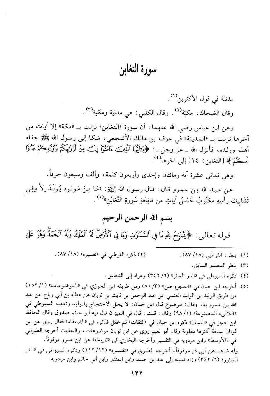 عن عبد الله بن عمرو قال: قال رسول الله صَلَّى اللهُ عَلَيْهِ وَسَلَّمَ: " ما من مولود يولد إلا وفي تشابيك رأسه مكتوب خمس آيات من فاتحة سورة التغابن ". بسم الله الرحمن الرحيم
