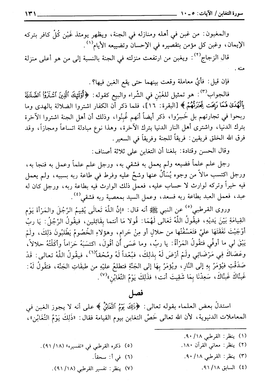 وروى القرطبي عن النبي صَلَّى اللَّهُ عَلَيْهِ وَسَلَّم َ أنه قال: «إنَّ اللَّهَ تَعَالَى يُقِيمُ الرَّجُلَ والمَرْأةَ يَوْم القِيامَةِ بَيْنَ يَديْهِ، فيقُولُ اللَّهُ تَعَالى لَهُمَا: قُولا مَا أنتما بِقَائِلين، فيقُولُ الرَّجُلُ: يَا ربِّ أوْجَبْتَ نَفَقَتَهَا عليَّ فَتَعَسَّفْتُها من حلالٍ أو مِنْ حَرامٍ، وهؤلاءِ الخُصُومُ يَطْلبُونَ ذلِكَ، ولَمْ يَبْقَ لي ما أوفِّي فتقُولُ المَرْأةُ: يا ربِّ، وما عَسَى أَن أقُولَ، اكتسَبَهُ حَرَاماً وأكَلْتُهُ حلالاً، وعَصَاكَ فِي مَرْضَاتِي ولَمْ أرْضَ لَهُ بِذَلِكَ، فبُعْداً لَهُ ومُحْقاً، فيقُولُ اللَّهُ تعالى: قَدْ صَدَقْتِ فيُؤمَرُ بِهِ إلى النَّارِ، ويُؤمَرُ بِهَا إلى الجَنَّةِ فتطلعُ عليْهِ من طبقَاتِ الجَنَّة، فتقُولُ لَهُ: غَبنَّاكَ غَبنَّاكَ، سَعِدْنَا بِمَا شَقِيتَ أنت؛ فذَلِكَ يَوْمُ التَّغَابُنِ» .