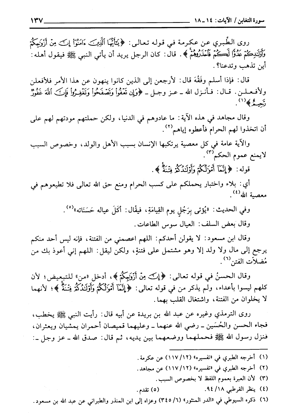 روى الطَّبري عن عكرمة في قوله تعالى: {يا أيها الذين آمنوا إِنَّ مِنْ أَزْوَاجِكُمْ وَأَوْلاَدِكُمْ عَدُوّاً لَّكُمْ فاحذروهم} . قال: كان الرجل يريد أن يأتي النبي صَلَّى اللَّهُ عَلَيْهِ وَسَلَّم َ فيقول أهله: أين تذهب وتدعنا؟ .