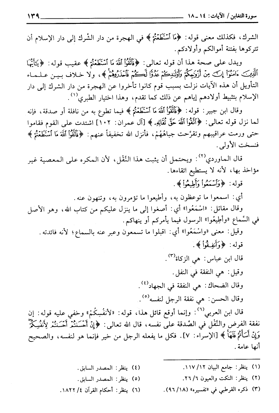 ويدل على صحة هذا قوله تعالى: {فاتقوا الله مَا استطعتم} عقيب قوله: {يا أيها الذين آمنوا إِنَّ مِنْ أَزْوَاجِكُمْ وَأَوْلاَدِكُمْ عَدُوّاً لَّكُمْ فاحذروهم} ، ولا خلاف بين علماء التأويل أن هذه الآيات نزلت بسبب قوم كانوا تأخروا عن الهجرة من دار الشرك إلى دار الإسلام بتثبيط أولادهم إياهم عن ذلك كما تقدم، وهذا اختيار الطبري.
