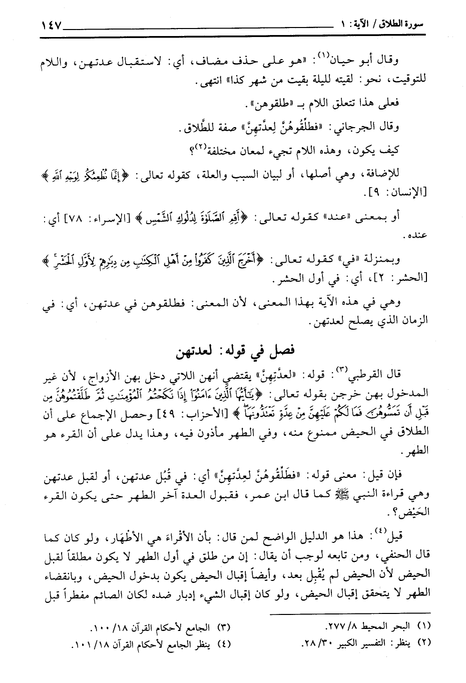 قال القرطبي: قوله: «لعدَّتِهِنَّ» يقتضي أنهن اللاتي دخل بهن الأزواج، لأن غير المدخول بهن خرجن بقوله تعالى: {يا أيها الذين آمنوا إِذَا نَكَحْتُمُ المؤمنات ثُمَّ طَلَّقْتُمُوهُنَّ مِن قَبْلِ أَن تَمَسُّوهُنَّ فَمَا لَكُمْ عَلَيْهِنَّ مِنْ عِدَّةٍ تَعْتَدُّونَهَا} [الأحزاب: 49] وحصل الإجماع على أن الطلاق في الحيض ممنوع منه، وفي الطهر مأذون فيه، وهذا يدل على أن القرء هو الطهر.