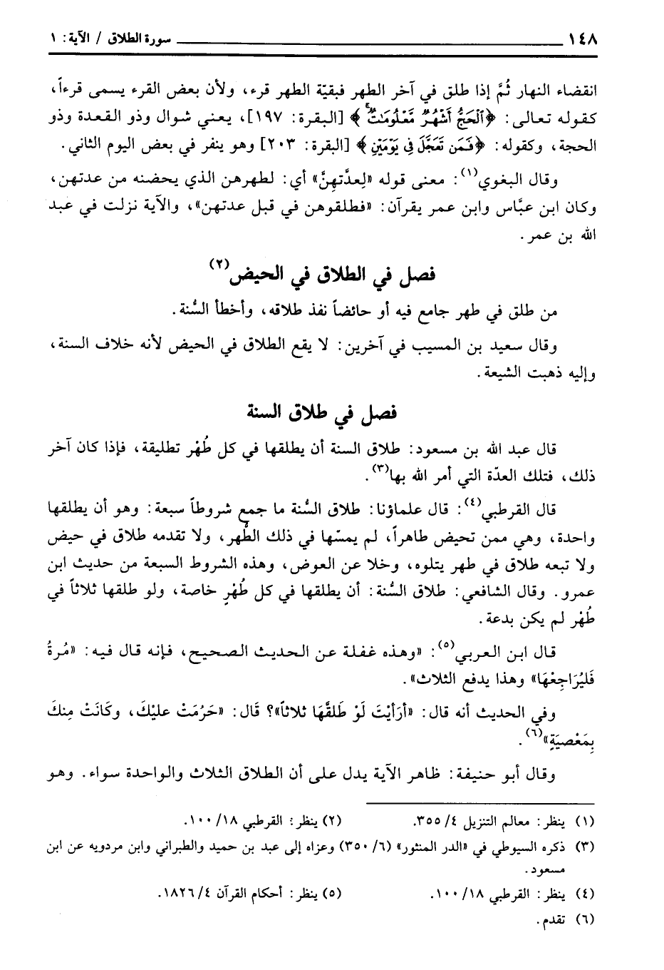 قال القرطبي: قال علماؤنا: طلاق السُّنة ما جمع شروطاً سبعة: وهو أن يطلقها واحدة، وهي ممن تحيض طاهراً، لم يمسّها في ذلك الطُّهر، ولا تقدمه طلاق في حيض ولا تبعه طلاق في طهر يتلوه، وخلا عن العوض، وهذه الشروط السبعة من حديث ابن عمرو. وقال الشافعي: طلاق السُّنة: أن يطلقها في كل طُهْرٍ خاصة، ولو طلقها ثلاثاً في طُهْر لم يكن بدعة.