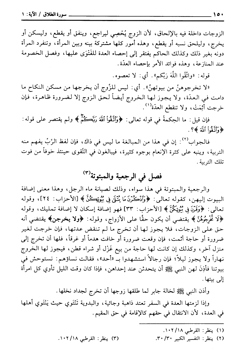 والرجعية والمبتوتة في هذا سواء، وذلك لصيانة ماء الرجل، وهذا معنى إضافة البيوت إليهن، كقوله تعالى: {واذكرن مَا يتلى فِي بُيُوتِكُنَّ} [الأحزاب: 24] ، وقوله تعالى: {وَقَرْنَ فِي بُيُوتِكُنَّ} [الأحزاب: 33] فهو إضافة إسكان لا إضافة تمليك، وقوله {لاَ تُخْرِجُوهُنَّ} يقتضي أن يكون حقًّا على الأزواج، وقوله: {ولا يخرجن} يقتضي أنه حق على الزوجات، فلا يجوز لها أن تخرج ما لم تنقض عدتها، فإن خرجت لغير ضرورة أو حاجة أثمت، فإن وقعت ضرورة أو خافت هدماً أو غرقاً، فلها أن تخرج إلى منزل آخر، وكذلك إن كانت لها حاجة من بيع غَزْل أو شراء قطن، فيجوز لها الخروج نهاراً ولا يجوز ليلاً؛ فإن رجالاً استشهدوا ب «أحد» ، فقالت نساؤهم: نستوحش في بيوتنا فإذِنَ لهن النبي صَلَّى اللَّهُ عَلَيْهِ وَسَلَّم َ أن يتحدثن عند إحداهن، فإذا كان وقت الليل تأوي كل امرأة إلى بيتها.