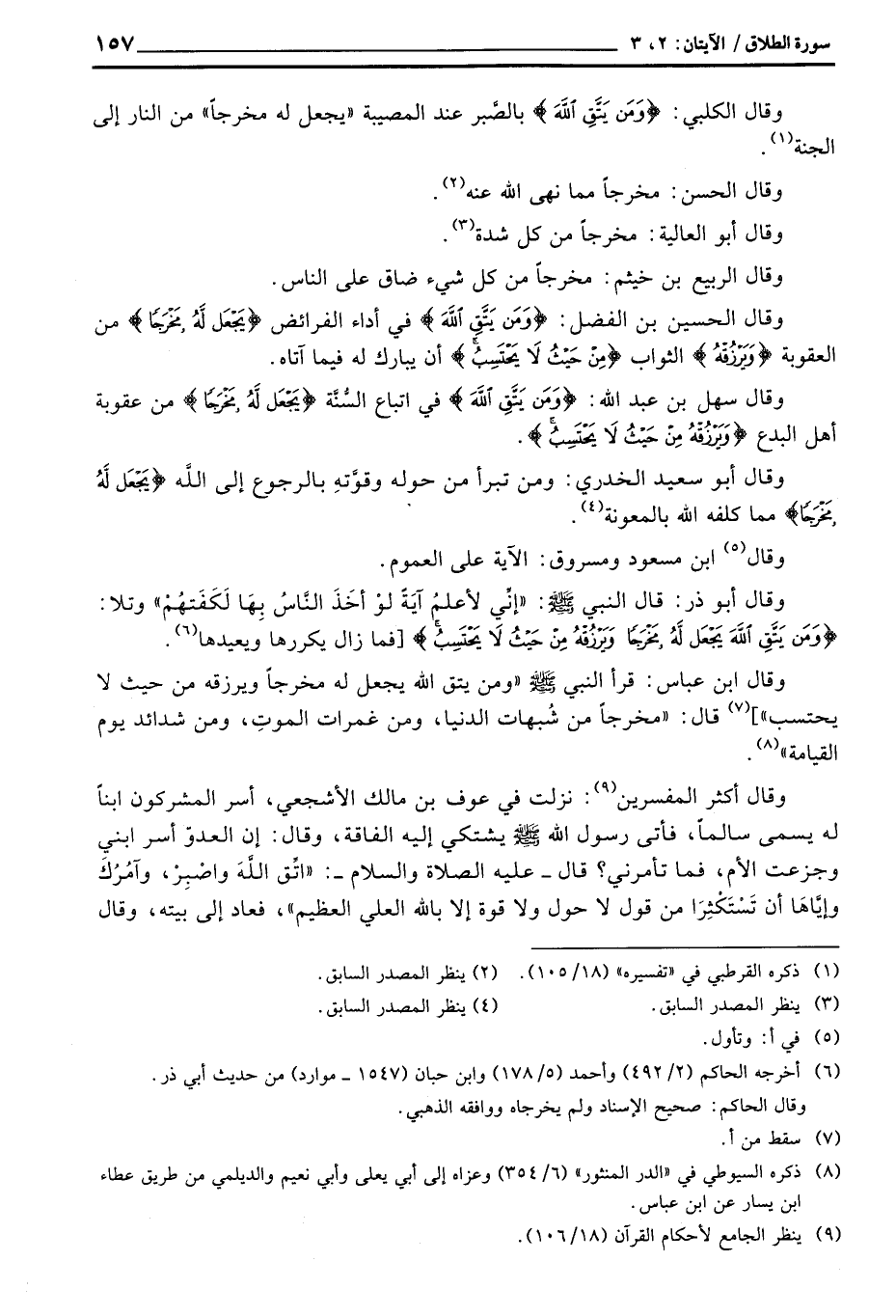 وقال ابن عباس: «قرأ النبي صَلَّى اللَّهُ عَلَيْهِ وَسَلَّم َ {ومن يتق الله يجعل له مخرجاً ويزرقه من حيث لا يحتسب} ] قال:» مخرجاً من شُبهات الدنيا، ومن غمرات الموتِ، ومن شدائد يوم القيامة «» .