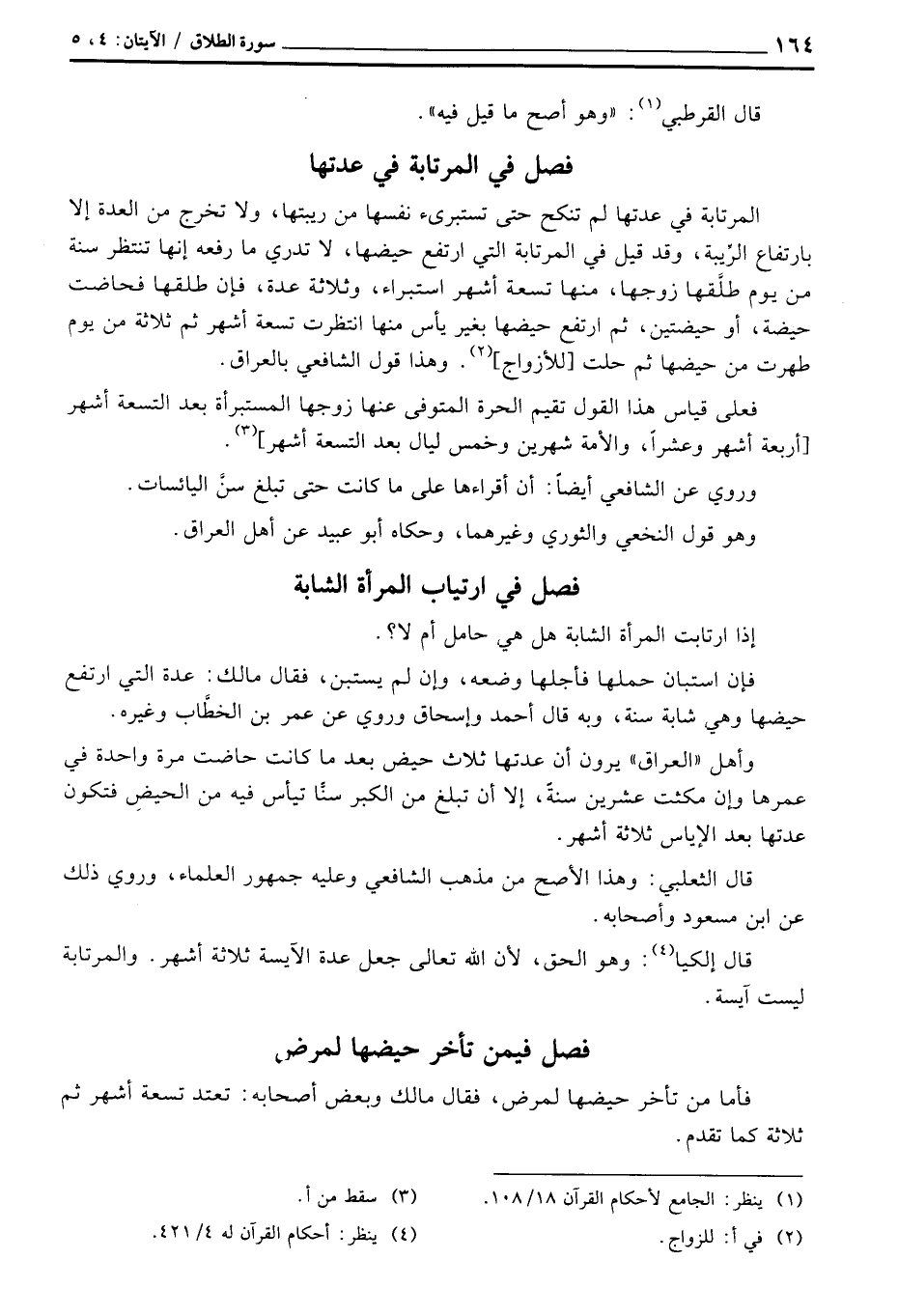 وأهل «العراق» يرون أن عدتها ثلاث حيض بعد ما كانت حاضت مرة واحدة في عمرها وإن مكثت عشرين سنةً، إلا أن تبلغ من الكبر سنًّا تيأس فيه من الحيضِ فتكون عدتها بعد الإياس ثلاثة أشهر.