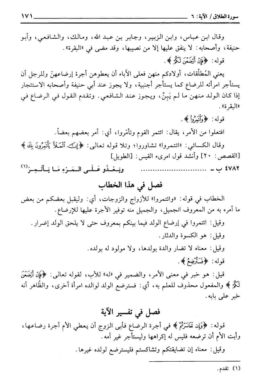 الخطاب في قوله: «وائتمروا» للأزواج والزوجات، أي: وليقبل بعضكم من بعض ما أمره به من المعروف الجميل، والجميل منه توفير الأجرة عليها للإرضاع.