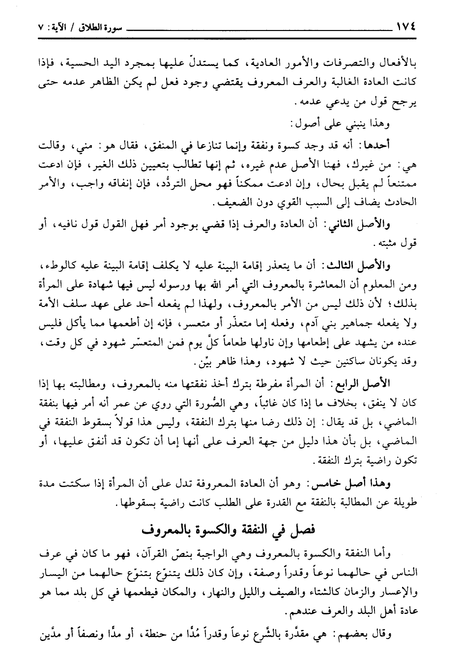 وهذا أصل خامس: وهو أن العادة المعروفة تدل على أن المرأة إذا سكتت مدة طويلة عن المطالبة بالنفقة مع القدرة على الطلب كانت راضية بسقوطها.