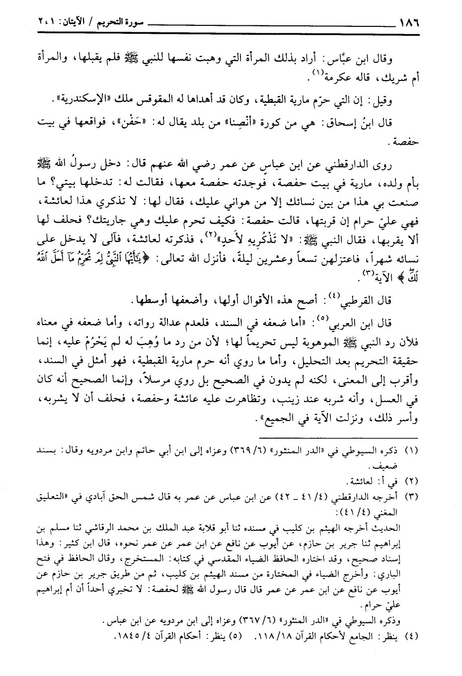 روى الدارقطني عن ابن عباسٍ عن عمر رَضِيَ اللَّهُ عَنْهم قال: «دخل رسولُ الله صَلَّى اللَّهُ عَلَيْهِ وَسَلَّم َ بأم ولده، مارية في بيت حفصة، فوجدته حفصة معها، فقالت له: تدخلها بيتي؟ ما صنعت بي هذا من بين نسائك إلا من هواني عليك، فقال لها: لا تذكري هذا لعائشة، فهي عليّ حرام إن قربتها، قالت حفصة: فكيف تحرم عليك وهي جاريتك؟ فحلف لها ألا يقربها، فقال النبي صَلَّى اللَّهُ عَلَيْهِ وَسَلَّم َ:» لا تَذْكُرِيهِ لأَحدٍ «، فذكرته لعائشة، فآلى لا يدخل على نسائه شهراً، فاعتزلهن تسعاً وعشرين ليلةً، فأنزل الله تعالى: {يا أيها النبي لِمَ تُحَرِّمُ مَآ أَحَلَّ الله لَكَ} » الآية.