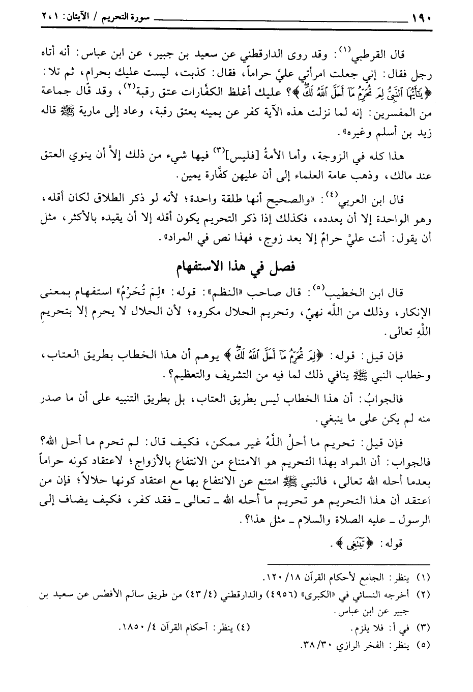 قال القرطبي: وقد روى الدارقطني عن سعيد بن جبير، عن ابن عباس: أنه أتاه رجل فقال: إني جعلت امرأتي عليَّ حراماً، فقال: كذبت، ليست عليك بحرامٍ، ثم تلا: {يا أيها النبي لِمَ تُحَرِّمُ مَآ أَحَلَّ الله لَكَ} ؟ عليك أغلظ الكفَّارات عتق رقبة، وقد قال جماعة من المفسرين: إنه لما نزلت هذه الآية كفر عن يمينه بعتق رقبة، وعاد إلى مارية صَلَّى اللَّهُ عَلَيْهِ وَسَلَّم َ قاله زيد بن أسلم وغيره «.