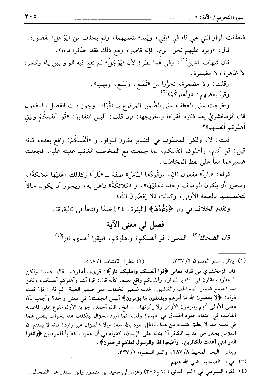 وخرجت على العطف على الضَّمير المرفوع ب «قُوْا» ، وجوز ذلك الفصل بالمفعول قال الزمخشريُّ بعد ذكره القراءة وتخريجها: فإن قلت: أليس التقديرُ: «قُوا أنفُسكُمْ وليَقِ أهلوكم أنفسهم» ؟ .