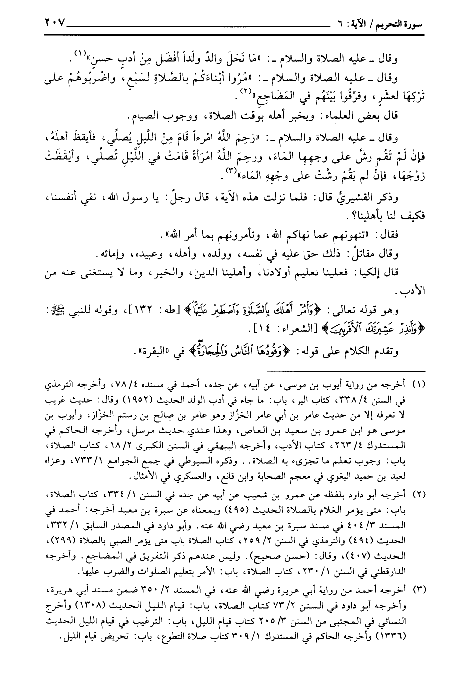 وقال - عَلَيْهِ الصَّلَاة وَالسَّلَام ُ -: «مُرُوا أبْناءَكُمْ بالصَّلاة لسَبْعٍ؛ واضْربُوهُمْ على تَرْكِهَا لعشْرٍ، وفرِّقُوا بَيْنَهُم في المَضَاجِعِ» .