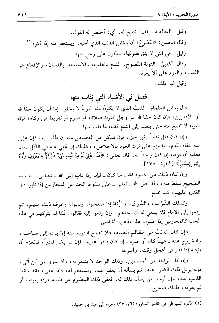 وقال الكلبيُّ: التوبة النَّصوح، الندم بالقلب، والاستغفار باللسان، والإقلاع عن الذنب، والعزم على ألاَّ يعود.
