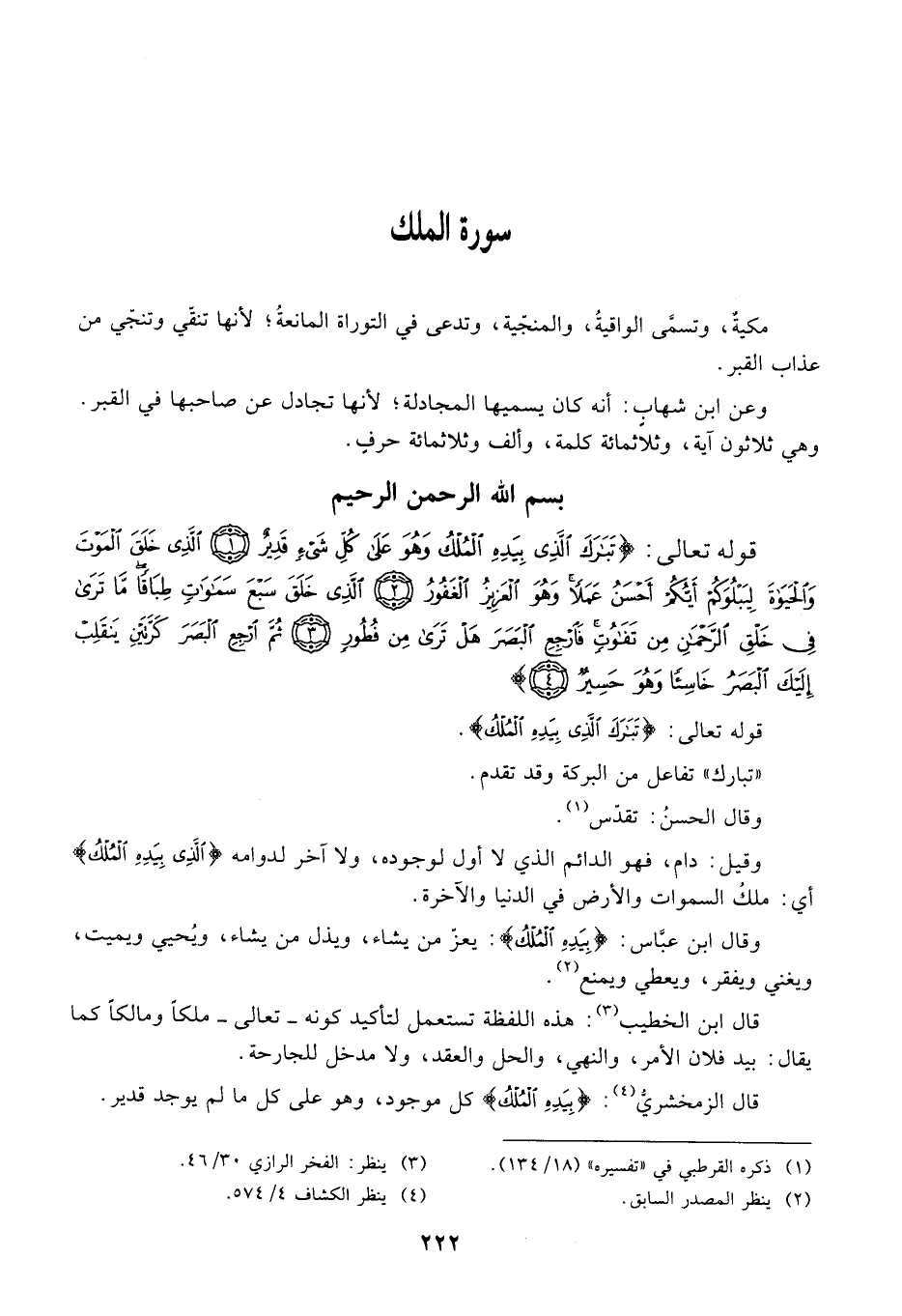 وعن ابن شهاب: أنه كان يسميها المجادلة؛ لأنها تجادل عن صاحبها في القبر. وهي ثلاثون آية، وثلاثمائة كلمة، وألف وثلاثمائة حرف. بسم الله الرحمن الرحيم قوله تعالى: {تَبَارَكَ الذي بِيَدِهِ الملك} .
