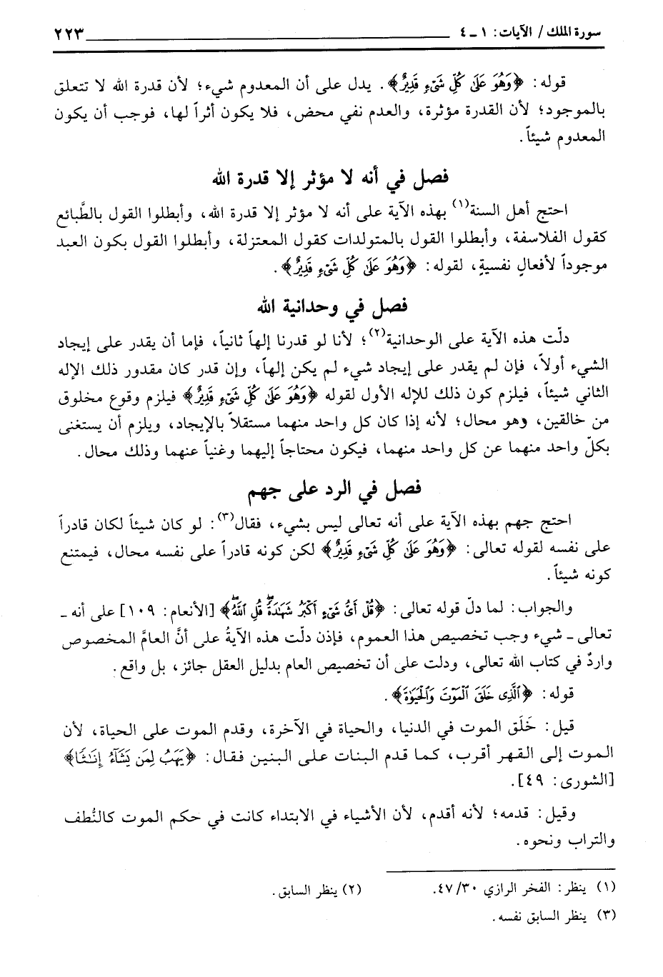 احتج أهل السنة بهذه الآية على أنه لا مؤثر إلا قدرة الله، وأبطلوا القول بالطَّبائع كقول الفلاسفة، وأبطلوا القول بالمتولدات كقول المعتزلة، وأبطلوا القول بكون العبد موجوداً لأفعالٍ نفسيةٍ، لقوله: {وَهُوَ على كُلِّ شَيْءٍ قَدِيرٌ} .