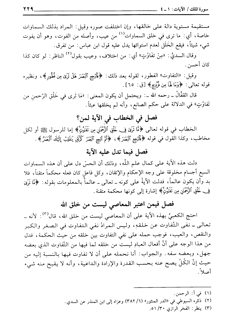 احتج الكعبيُّ بهذه الآية على أن المعاصي ليست من خلق الله، قال: - لأنه تعالى - نفى التَّفاوت عن خلقهِ، وليس المرادُ نفي التفاوت في الصغر والكبر والنقص، والعيب، فوجب حمله على نفي التفاوت بين خلقه من حيث الحكمة، فدل من هذا الوجه على أنَّ أفعال العبادِ ليست من خلقه لما فيها من التَّفاوت الذي بعضه جهل، وبعضه سفه. والجواب: أنا نحمله على أن لا تفاوت فيها بالنسبة إليه من حيث إنَّ الكُلَّ يصح عنه بحسب القدرة والإرادة والداعية، وأنه لا يقبح منه شيء أصلاً.
