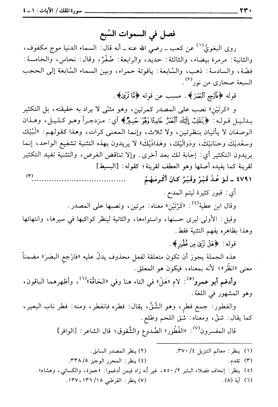 و «كرتَيْنِ» نصب على المصدر كمرتين، وهو مثنّى لا يراد به حقيقته، بل التكثير بدليل قوله: {يَنْقَلِبْ إِلَيْكَ البَصَرُ خَاسِئاً وَهُوَ حَسِيرٌ} أي: مزدجراً وهو كليل، وهذان الوصفان لا يأتيان بنظرتين، ولا ثلاث، وإنما المعنى كرات، وهذا كقولهم: «لَبَّيْك وسعْديْكَ وحنَانيْكَ، ودَوالَيْك، وهَذَاذَيْكَ» لا يريدون بهذه التثنية تشفيع الواحد، إنما يريدون التكثير أي: إجابة لك بعد أخرى. وإلا تناقض الغرض، والتثنية تفيد التكثير لقرينة كما يفيده أصلها وهو العطف لقرينة؛ كقوله: [البسيط]