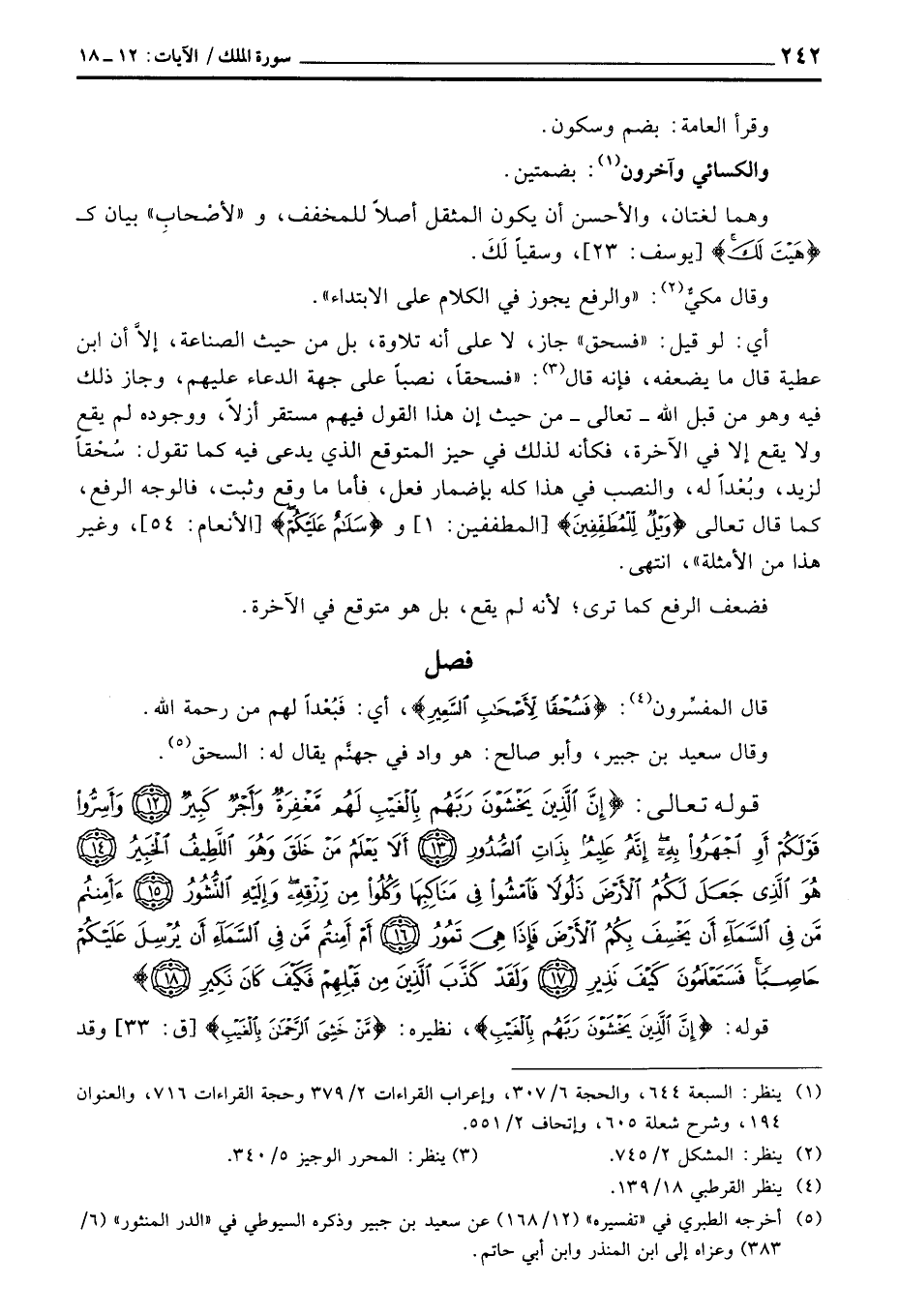 أي: لو قيل: «فسحق» جاز، لا على أنه تلاوة، بل من حيث الصناعة، إلاَّ أن ابن عطية قال ما يضعفه، فإنه قال: «فسحقاً، نصباً على جهة الدعاء عليهم، وجاز ذلك فيه وهو من قبل الله - تعالى - من حيث إن هذا القول فيهم مستقر أزلاً، ووجوده لم يقع ولا يقع إلا في الآخرة، فكأنه لذلك في حيز المتوقع الذي يدعى فيه كما تقول: سُحْقاً لزيد، وبُعْداً له، والنصب في هذا كله بإضمار فعل، فأما ما وقع وثبت، فالوجه الرفع، كما قال تعالى {وَيْلٌ لِّلْمُطَفِّفِينَ} [المطففين: 1] و {سَلاَمٌ عَلَيْكُمْ} [الأنعام: 54] ، وغير هذا من الأمثلة» ، انتهى.