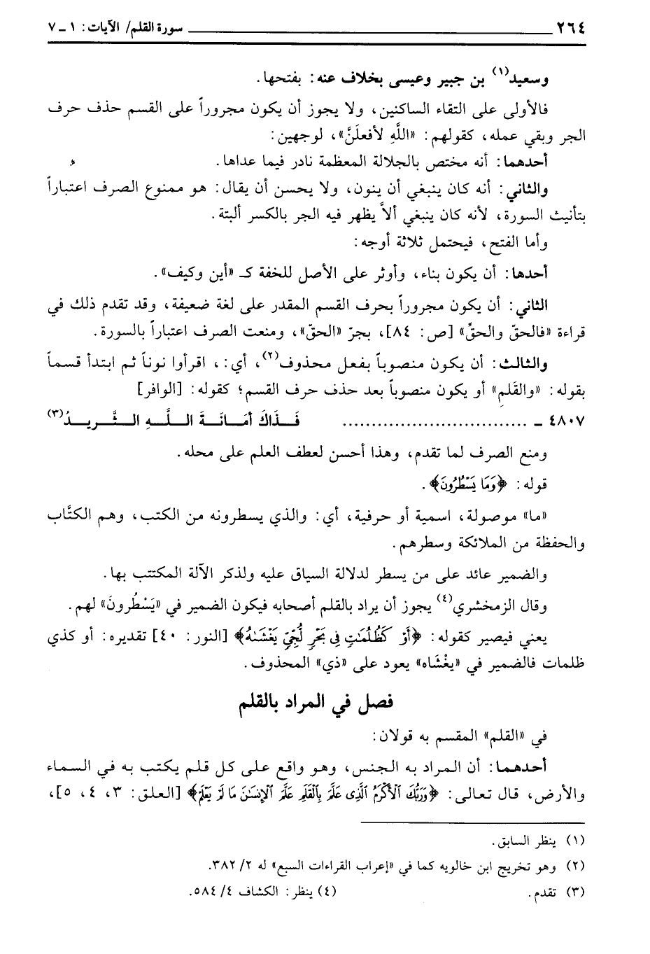 والثالث: أن يكون منصوباً بفعل محذوف، أي:، اقرأوا نوناً ثم ابتدأ قسماً بقوله: «والقَلمِ» أو يكون منصوباً بعد حذف حرف القسم؛ كقوله: [الوافر]