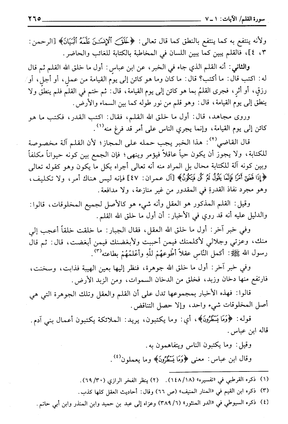 والثاني: أنه القلم الذي جاء في الخبر، عن ابن عباسٍ: أول ما خلق الله القلم ثم قال له: اكتب قال: ما أكتب؟ قال: ما كان وما هو كائن إلى يوم القيامة من عملٍ، أو أجلٍ، أو رزقٍ، أو أثرٍ، فجرى القلمُ بما هو كائن إلى يوم القيامة، قال: ثم ختم في القلم فلم ينطق ولا ينطق إلى يوم القيامة، قال: وهو قلم من نور طوله كما بين السماء والأرض.