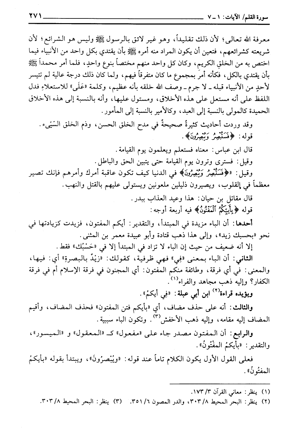 الثاني: أن الباء بمعنى «فِي» فهي ظرفية، كقولك: «زيْدٌ بالبصرةِ» أي: فيها، والمعنى: في أي فرقة، وطائفة منكم المفتون: أي المجنون في فرقة الإسلام أم في فرقة الكفار؟ وإليه ذهب مجاهد والفراء.