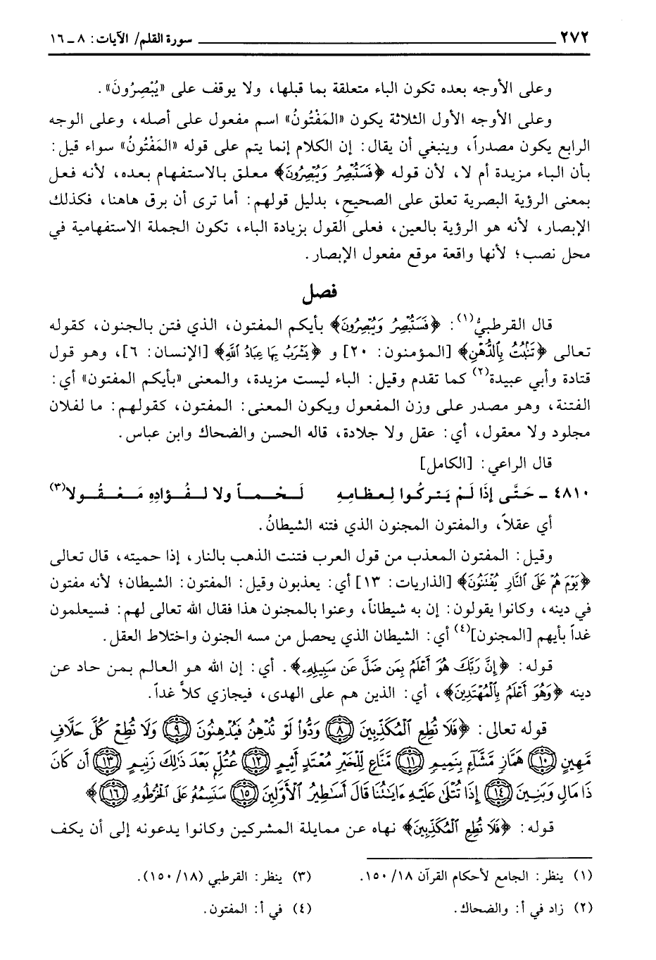 قال القرطبيُّ: {فَسَتُبْصِرُ وَيُبْصِرُونَ} بأيكم المفتون، الذي فتن بالجنون، كقوله تعالى: {تَنبُتُ بالدهن} [المؤمنون: 20] و {يَشْرَبُ بِهَا عِبَادُ الله} [الإنسان: 6] ، وهو قول قتادة وأبي عبيدة كما تقدم وقيل: الباء ليست مزيدة، والمعنى «بأيكم المفتون» أي: الفتنة، وهو مصدر على وزن المفعول ويكون المعنى: المفتون، كقولهم: ما لفلان مجلود ولا معقول، أي: عقل ولا جلادة، قاله الحسن والضحاك وابن عباس.