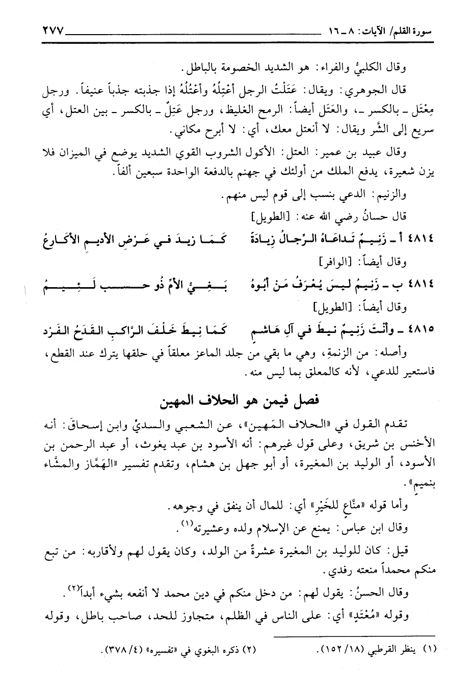 تقدم القول في «الحلاف المَهين» ، عن الشعبي والسديِّ وابن إسحاقَ: أنه الأخنس بن شريق، وعلى قول غيرهم: أنه الأسود بن عبد يغوث، أو عبد الرحمن بن الأسود، أو الوليد بن المغيرة، أو أبو جهل بن هشام، وتقدم تفسير «الهَمَّاز والمشَّاء بنميمٍ» .