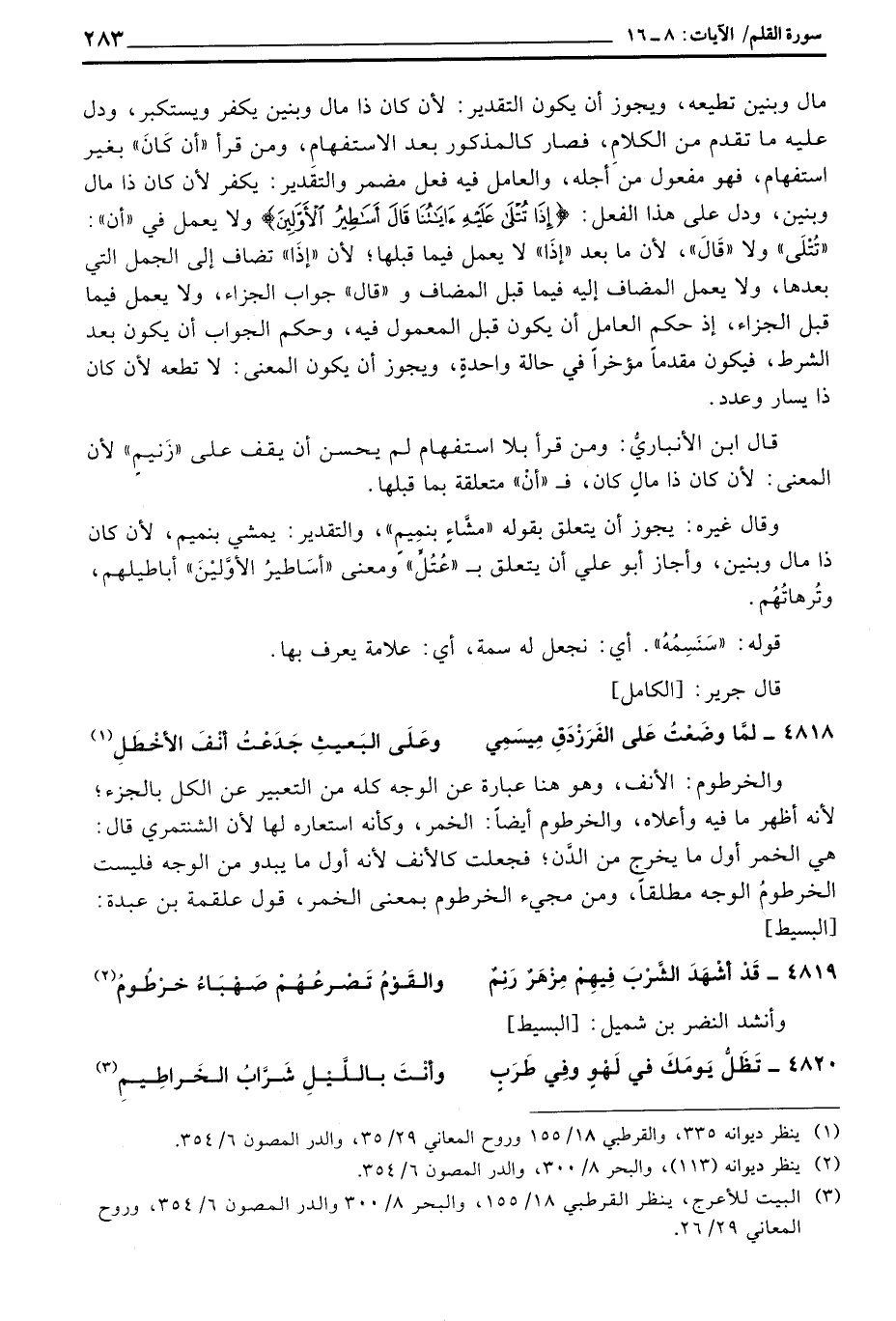 وقال غيره: يجوز أن يتعلق بقوله «مشَّاءٍ بنمِيمٍ» ، والتقدير: يمشي بنميم، لأن كان ذا مال وبنين، وأجاز أبو علي أن يتعلق ب «عُتُلٍّ» ومعنى «أسَاطيرُ الأوَّليْنَ» أباطيلهم، وتُرهاتُهُم.