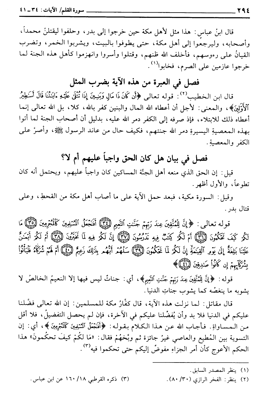 قال ابن الخطيب: قوله تعالى {أَن كَانَ ذَا مَالٍ وَبَنِينَ إِذَا تتلى عَلَيْهِ آيَاتُنَا قَالَ أَسَاطِيرُ الأولين} [القلم: 14 - 15] ، والمعنى: لأجل أن أعطاه الله المال والبنين كفر بالله، كلا، بل الله تعالى إنما أعطاه ذلك للابتلاء، فإذا صرفه إلى الكفر دمر الله عليه، بدليل أن أصحاب الجنة لما أتوا بهذه المعصيةِ اليسيرةِ دمر الله جنتهم، فكيف حال من عاند الرسول صَلَّى اللَّهُ عَلَيْهِ وَسَلَّم َ، وأصرَّ على الكفر والمعصيةِ.