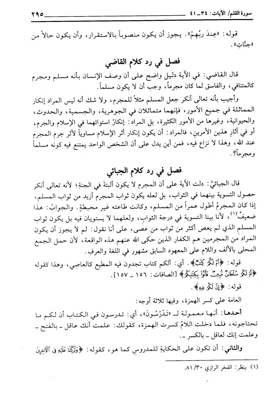 قال الجبائيُّ: دلت الآية على أن المجرم لا يكون ألبتةَ في الجنةِ؛ لأنه تعالى أنكر حصول التسوية بينهما في الثواب، بل لعله يكون ثواب المجرم أزيد من ثواب المسلم، إذا كان المجرمُ أطول عمراً من المسلم، وكانت طاعته غير محبطةٍ. والجوابُ: هذا ضعيفٌ، لأنا بينا التسوية في درجة الثوابِ، ولعلهما لا يستويان فيه بل يكون ثواب المسلمِ الذي لم يعص أكثر من ثواب من عصى، على أنا نقول: لم لا يجوز أن يكون المراد من المجرمين هم الكفار الذين حكى الله عنهم هذه الواقعة، لأن حمل الجمع المحلى بالألف واللام على المعهود السابق مشهور في اللغة والعرفِ.
