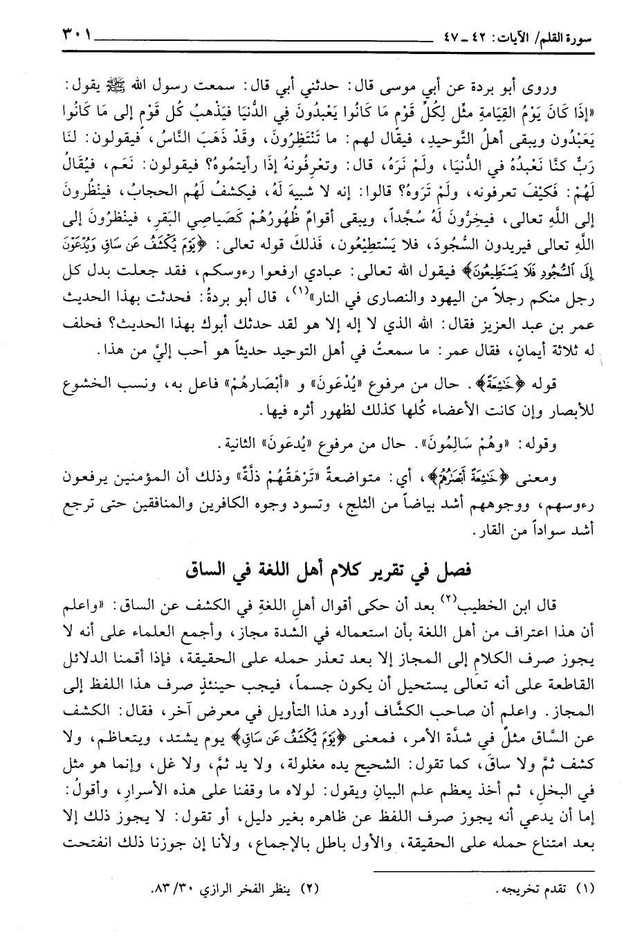 قال ابن الخطيب بعد أن حكى أقوال أهلِ اللغةِ في الكشف عن الساق: واعلم أن هذا اعتراف من أهل اللغة بأن استعماله في الشدة مجاز، وأجمع العلماء على أنه لا يجوز صرف الكلامِ إلى المجاز إلا بعد تعذر حمله على الحقيقة، فإذا أقمنا الدلائل القاطعة على أنه تعالى يستحيل أن يكون جسماً، فيجب حينئذٍ صرف هذا اللفظ إلى المجاز.