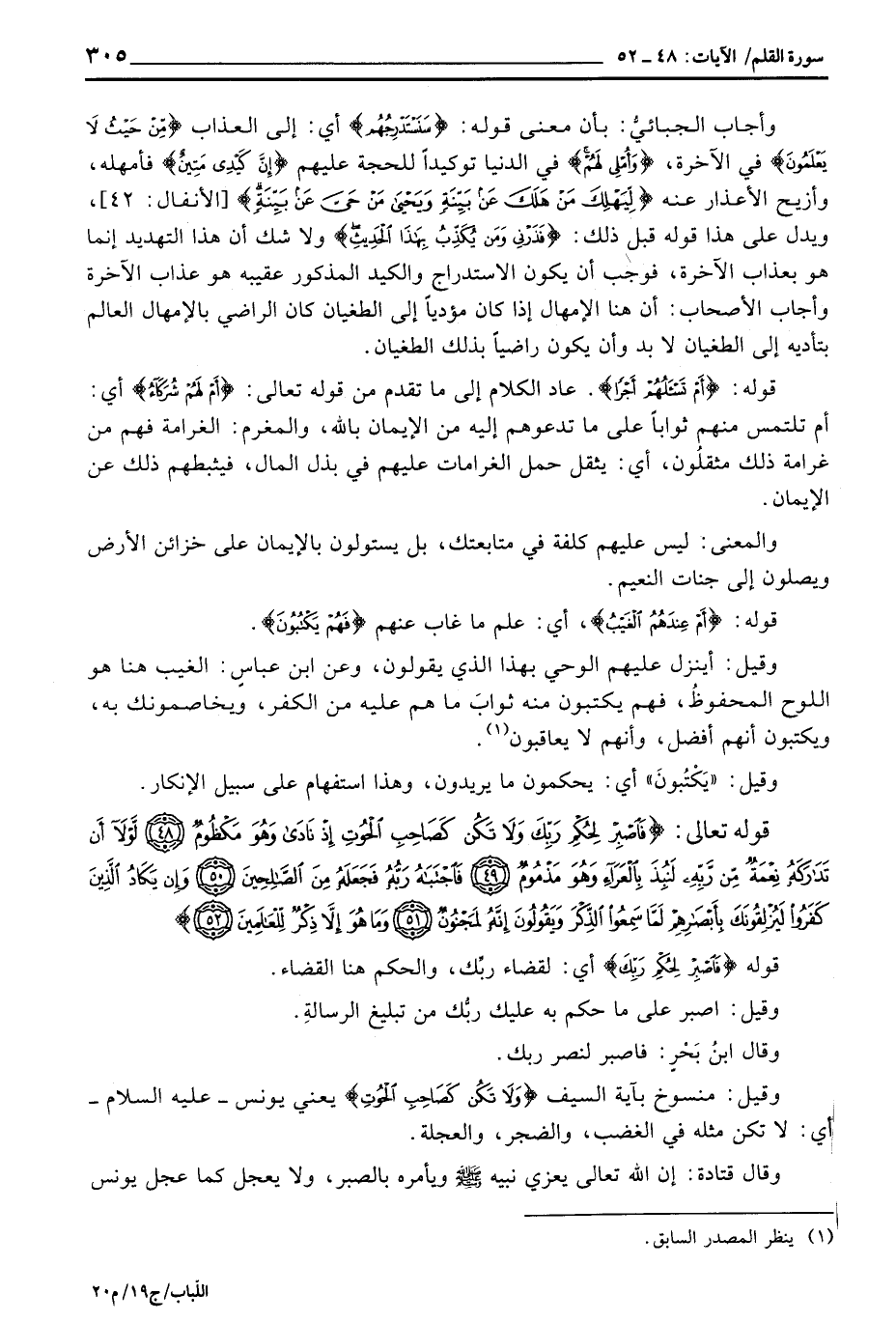وقيل: منسوخ بآية السيف {وَلاَ تَكُن كَصَاحِبِ الحوت} يعني يونس - عليه السلام - أي: لا تكن مثله في الغضب، والضجر، والعجلة.