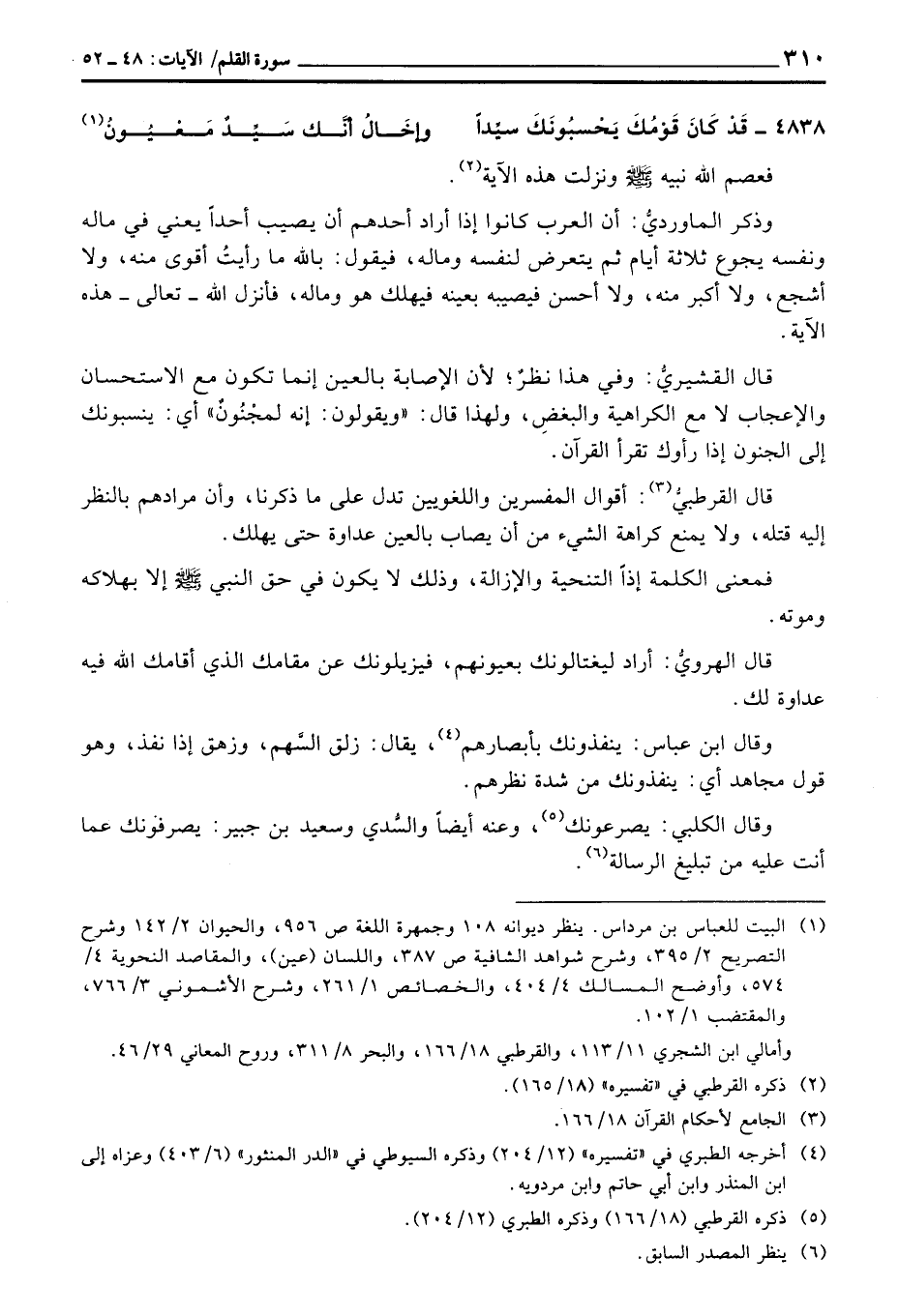 قال القشيريُّ: وفي هذا نظرٌ؛ لأن الإصابة بالعين إنما تكون مع الاستحسان والإعجاب لا مع الكراهية والبغضِ، ولهذا قال: «ويقولون: إنه لمجْنُونٌ» أي: ينسبونك إلى الجنون إذا رأوك تقرأ القرآن.