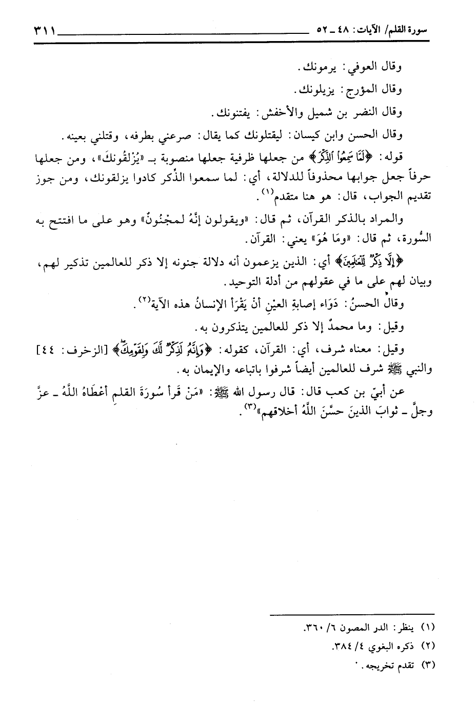 عن أبيّ بن كعب قال: قال رسول الله صَلَّى اللَّهُ عَلَيْهِ وَسَلَّم َ: «مَنْ قَرأ سُورَةَ القلمِ أعْطَاهُ اللَّهُ - عزَّ وجلَّ - ثوابَ الذينَ حسَّنَ اللَّهُ أخلاقهم» .
