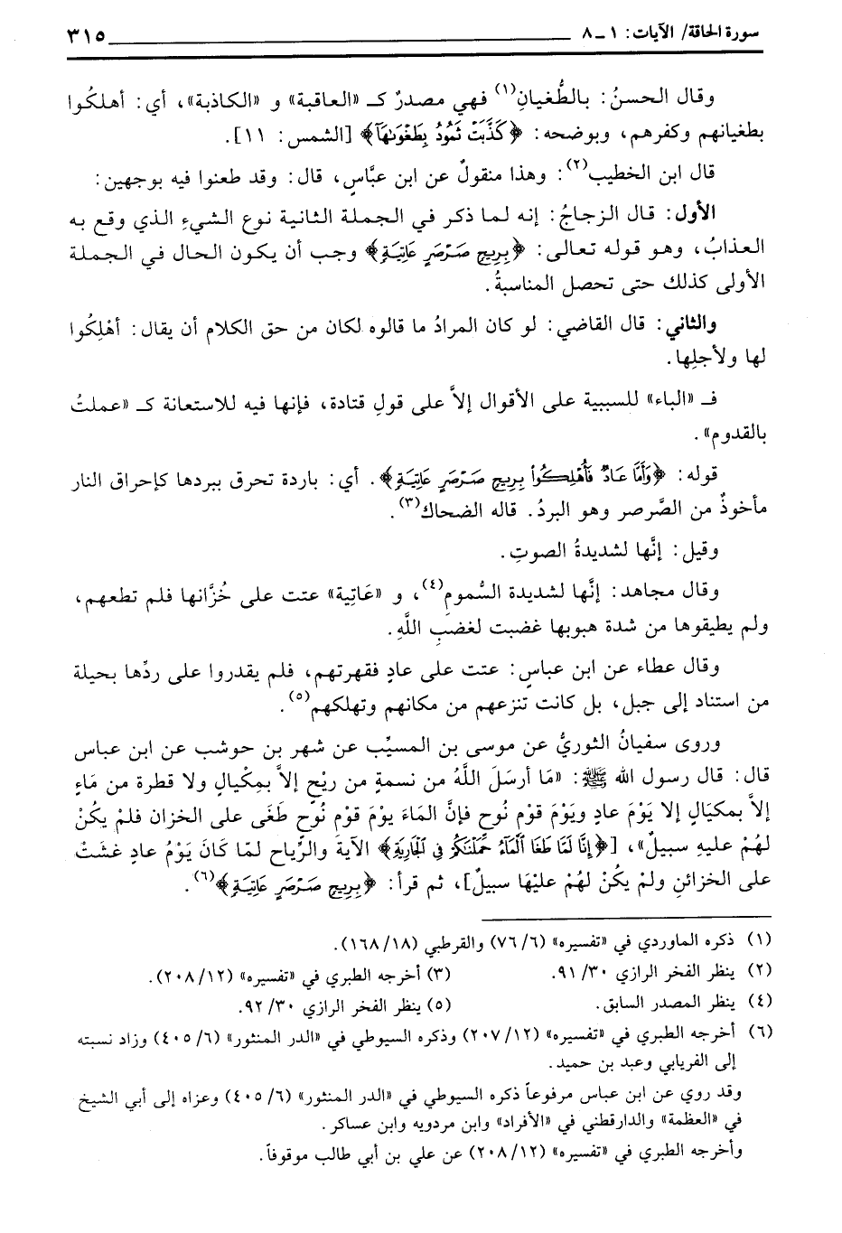 قوله: {وَأَمَّا عَادٌ فَأُهْلِكُواْ بِرِيحٍ صَرْصَرٍ عَاتِيَةٍ} . أي: باردة تحرق ببردها كإحراق النار مأخوذٌ من الصَّرصر وهو البردُ. قاله الضحاك.