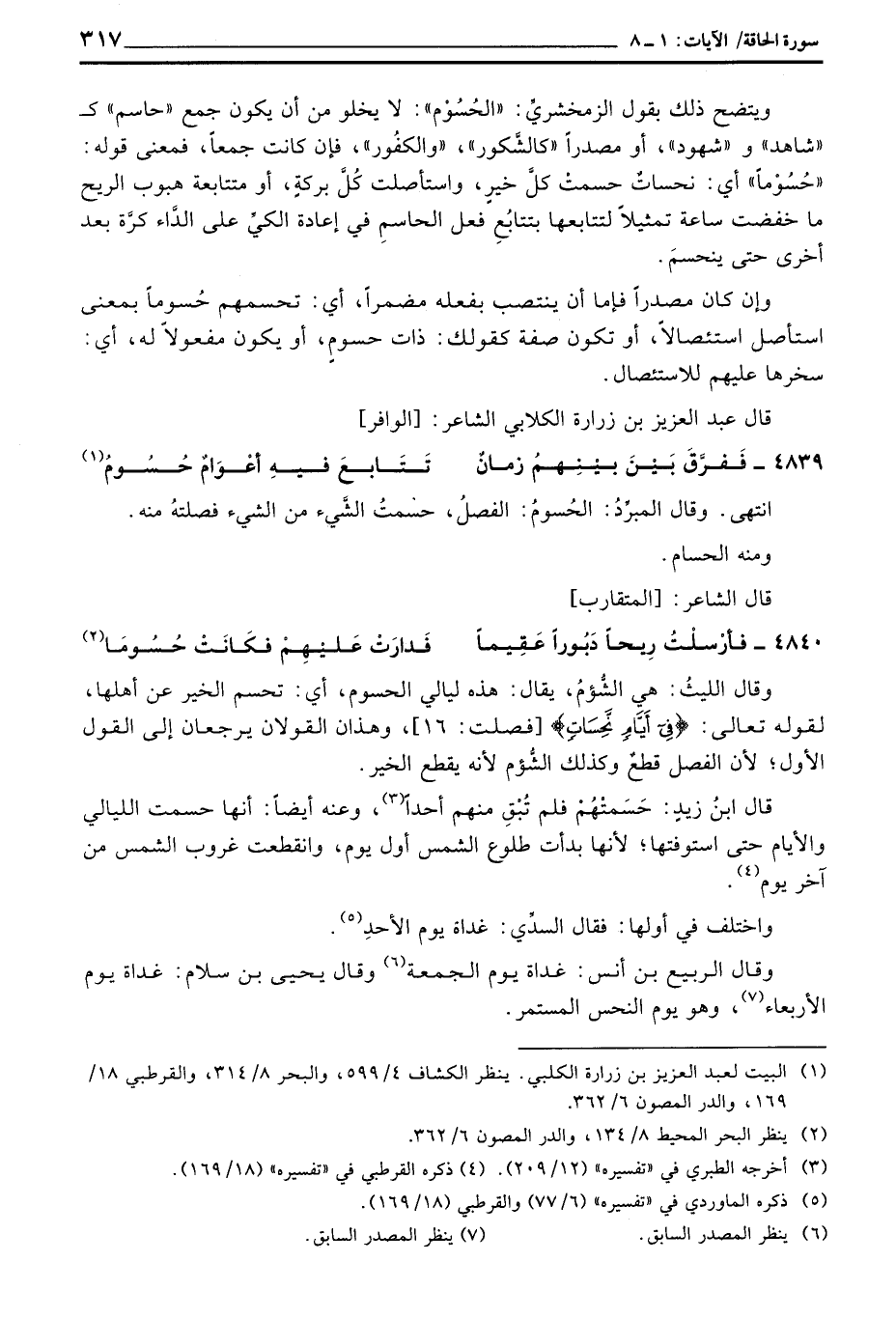 ويتضح ذلك بقول الزمخشريِّ: «الحُسُوْم» : لا يخلو من أن يكون جمع «حاسم» ك «شاهد» و «شهود» ، أو مصدراً «كالشَّكور» ، «والكفُور» ، فإن كانت جمعاً، فمعنى قوله: «حُسُوْماً» أي: نحساتٌ حسمتْ كلَّ خيرٍ، واستأصلت كُلَّ بركةٍ، أو متتابعة هبوب الريح ما خفضت ساعة تمثيلاً لتتابعها بتتابُعِ فعل الحاسمِ في إعادة الكيِّ على الدَّاء كرَّة بعد اخرى حتى ينحسمَ.