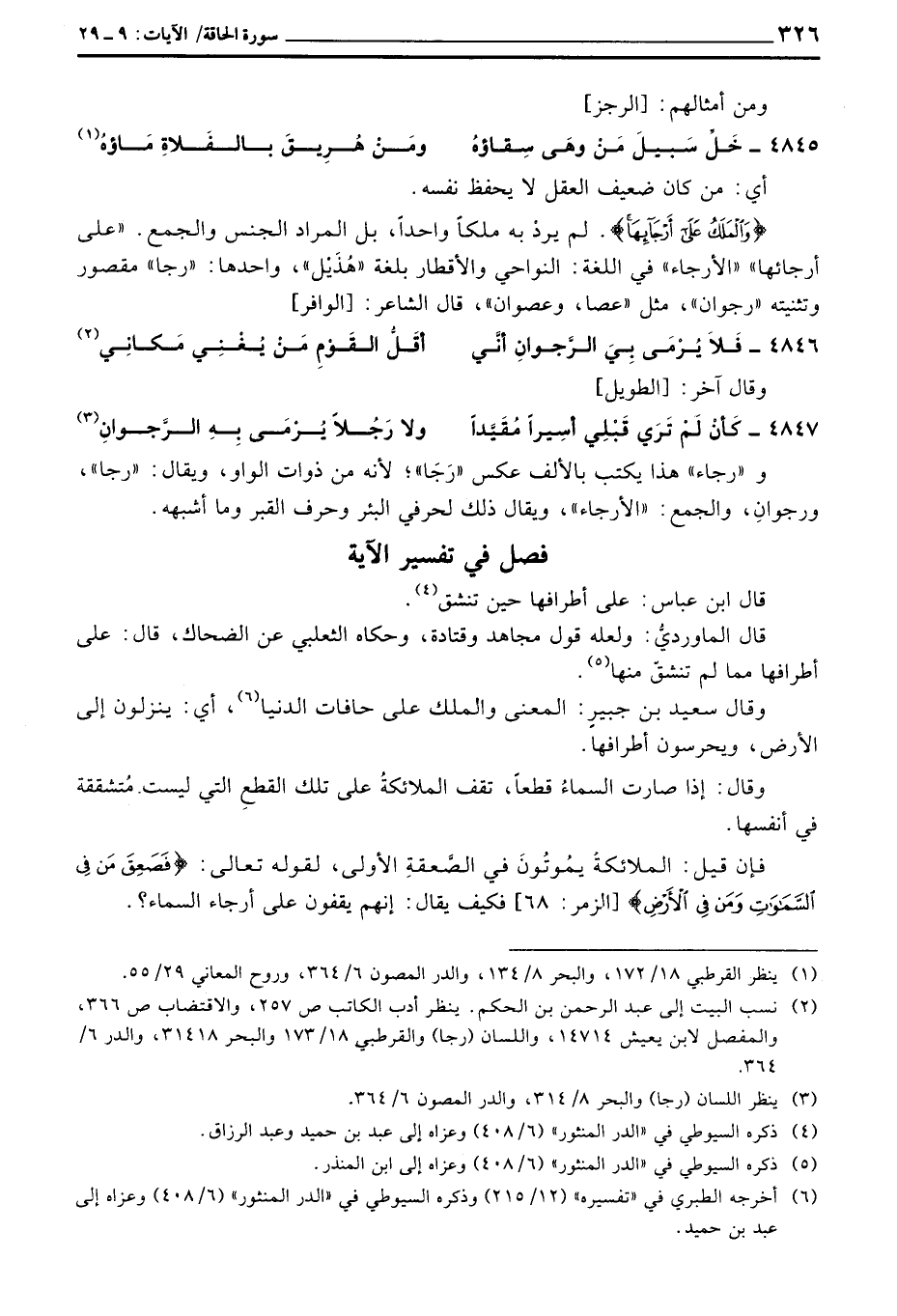 وقال: إذا صارت السماءُ قطعاً، تقف الملائكةُ على تلك القطعِ التي ليست مُتشققة في أنفسها.